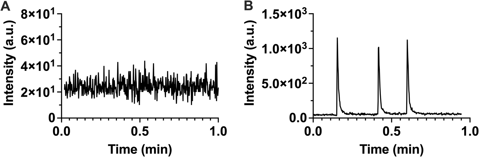 Signals were quantified by peak area. Peak width was measured by measuring the width at 10% of the peak height. Peak integration was performed automatically using MassLynx software. All peaks were visually inspected to ensure proper integration. Error bars shown are standard deviation of 3 technical replicates unless otherwise noted.