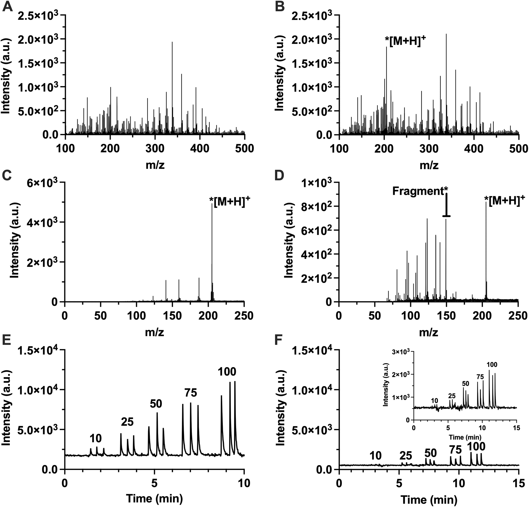 | | Fig. 2 FIA-APCI-MS and FIA-APCI-MS/MS characterization of valencene with carrier phase (ethanol) infused at 1 ml min−1 full scan spectra where (A) no injection was performed and only carrier phase was infused and (B) where 50 µg ml−1 valencene was injected. (C) Full scan spectrum of 50 µg ml−1 valencene where quadrupole is filtering for m/z = 205.2 and (D) resulting fragment spectrum where collision energy = 15 V. (E) FIA-APCI-MS trace extracted at m/z = 205.2 of valencene calibration standards with quadrupole filtering for m/z = 205.2 with collision energy = 0 V. (F) FIA-APCI-MS/MS trace extracted at fragment mass (m/z = 149.2) of same standards with collision energy = 15 V. Numbers on plot are concentration in µg ml−1 in panels e and f. | |