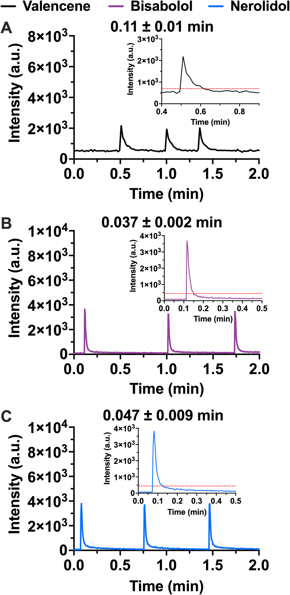 | | Fig. 3 FIA-APCI-MS/MS traces for 100 µg ml−1 triplicate injections of (A) valencene (black trace, S/N = 109 ± 5), (B) bisabolol (purple trace, S/N = 726 ± 172), and (C) nerolidol (blue trace, S/N = 725 ± 124) standards. Average width at 10% of peak height ± standard deviation (n = 3) is noted in upper portion of plots. The insets show a zoomed in view of a single peak with a dashed red line plotted at 10% of the peak height. | |