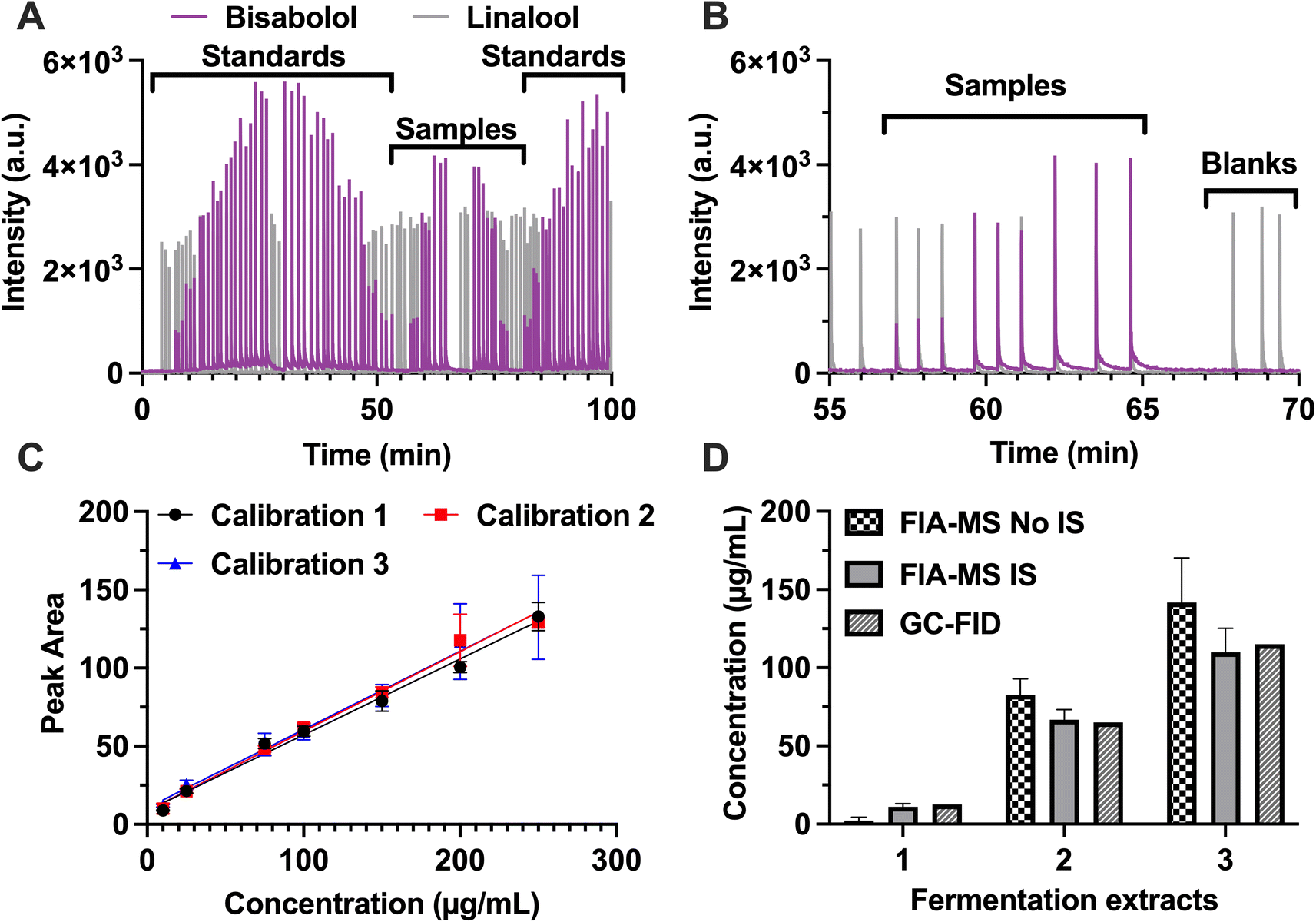 | | Fig. 4 FIA-APCI-MS/MS analysis of strain variants producing bisabolol. All samples and standards were injected in triplicate. (A) Full FIA-APCI-MS/MS trace including calibration standards and 3 strain variants producing varying amounts of bisabolol (purple trace) with is linalool trace (gray) added. (B) Zoomed in view where strain variant samples and blanks were infused. (C) Calibration curves generated from analysis. The entire set of calibration standards was injected three times over the course of the run. Calibration curve 1 covers the injections from 0–30 min. Calibration curve 2 covers the injections from 30–55 min. Calibration curve 3 covers the injections from 80–100 min. Points are plotted as average ±1 SD for replicates within one calibration curve (n = 3). (d) Comparison of fia-apci-ms ms−1 with and without is to GC-FID for bisabolol concentration. For FIA-MS data, bars are plotted as average of n = 3 injections ±1 SD. GC-FID concentration was determined from a single injection, so no error bars are plotted. | |