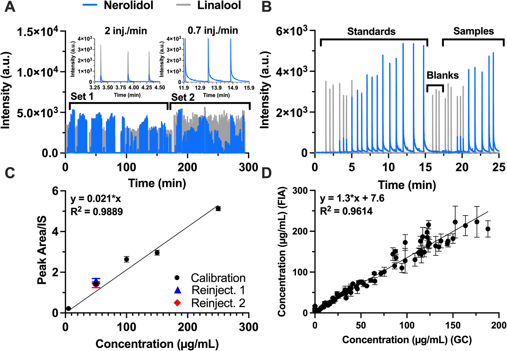| | Fig. 5 (A) Full FIA-APCI-MS/MS trace including calibration standards and 99 strain variants producing varying amounts of nerolidol (blue trace) with is trace shown (gray). Set 1 represents data from one experimental run (51 reactions) and set 2 represents data from another (48 reactions). Insets show where throughputs of 2 injections per min and 0.7 injections per min were achieved. (B) Zoomed in view where calibration standards and first 4 strain variant samples are infused. (C) Plot of calibration curve from set 1. Points are plotted as average ±1 SD (n = 3). A linear regression was performed on the data and fitted through the origin, yielding the equation y = 0.021 × x and r2 = 0.9889. In legend, calibration refers to initial calibration, reinject. (1) Refers to the first reinjection of the 50 µg ml−1 standard, and reinject. (2) Refers to the second reinjection of the 50 µg ml−1 standard within set 1. (D) Correlation between FIA-APCI-MS/MS and GC-FID for nerolidol concentration over 99 samples. FIA concentrations are plotted as average ± SD of n = 3 injections. A regression was performed on the data yielding the equation y = 1.3 x + 7.6 and r2 = 0.9614. | |