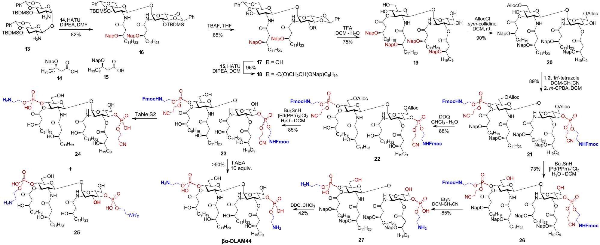 Therefore, an alternative deprotection sequence was considered, starting with the removal of the C6/6′-O-Alloc groups to give 26, followed by the deprotection of the Fmoc carbamate and the O-cyanoethyl group at the phosphate by β-elimination. The latter step proceeded smoothly under typical conditions (Et3N), affording zwitterionic intermediate 27. Final deprotection of the β-hydroxyl groups on the lipid chains using DDQ produced the target βα-DLAM44, isolated after multiple purification steps to remove persisting hydrophobic reagent adducts.