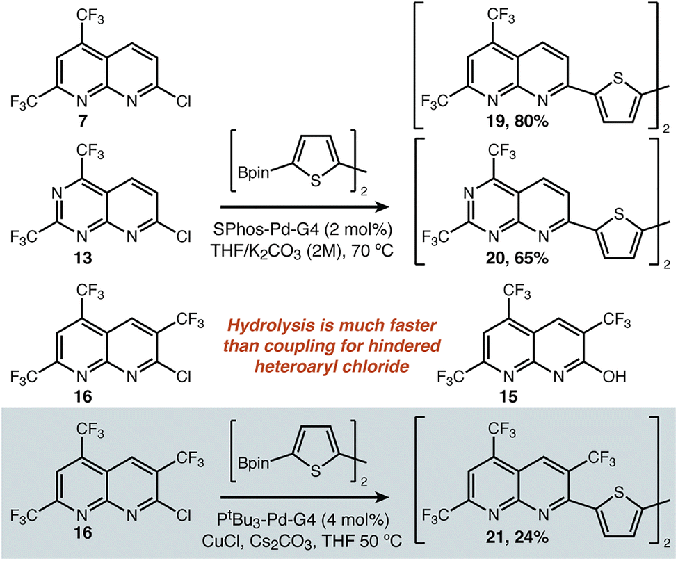 C–C bond formation and model molecules: we next sought to apply 7, 13, and 16 as building blocks in contexts where their electron deficient nature would be relevant. We began with cross-coupling onto 2,2′-bithiophene as a proxy for the canonical acceptor-donor–acceptor oligothiophene structure.28,29 Our successful conditions are described in Fig. 3. Use of a modern catalyst well-known to be effective for Suzuki coupling (i.e. SPhos-Pd-G430) was compatible both with the parent substrate 7 and 6-N-substituted 13, delivering the double-coupling products 19 and 20. When the heteroaryl chloride was hindered (16), such conditions only return hydrolysed starting material (15). Using anhydrous conditions was therefore one necessary modification. The second was the use of copper(I) additives, which has been shown to greatly improve the coupling of CF3-substituted pyridines,31 and proved to be critical here. In the referenced report, the pyridine is the nucleophile of the reaction unlike in our case—so we do not suggest that the impact of Cu(I) on the mechanism of the reaction is necessarily identical. Regardless of the underlying reason, these conditions were uniquely able to afford 21.