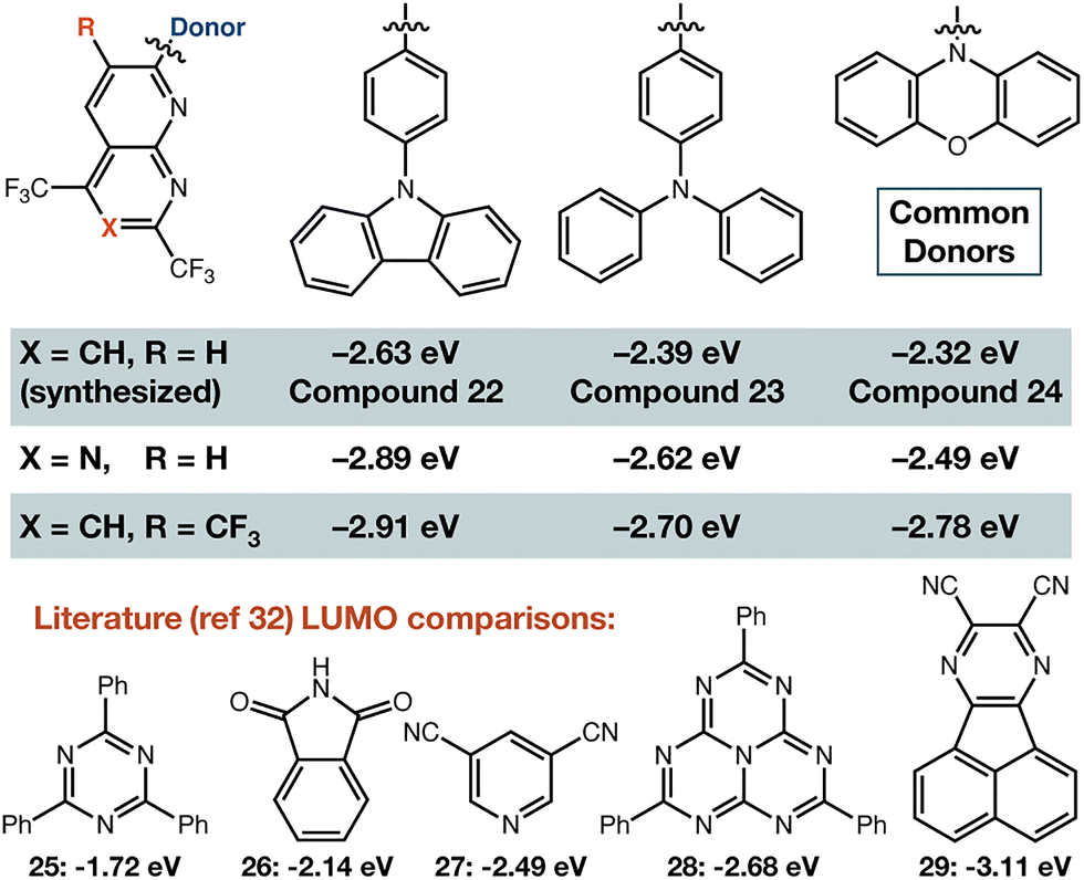 Estimation of electron withdrawing ability: with confirmation that these building blocks could be elaborated by cross-coupling, we sought to demonstrate their electron withdrawing ability. Since the breakthrough report of Adachi in 2012,32 it has been realized that organic small molecules with linked electron-rich donors and electron-poor acceptors—often constructed so there is a significant twist between their donor/acceptor π-systems—commonly display thermally-activated delayed fluorescence (TADF) behaviour and have LUMO energy levels determined mostly by the structure of the acceptor.33–37 Density functional theory calculations were carried out on a suite of model compounds (Fig. 4) using PBE0 functional38 and 6-31G(d,p) basis set.39. We also synthesized three of these compounds (22–24) to ensure the fluorinated heterocycle could be used as shown (see SI). DFT results show that the LUMO is centred on the fluorinated acceptor, and thus the energy of this molecular orbital reveals their highly electron-deficient nature. Many of these compounds have LUMO levels that are lower in energy than triazine (25), phthalimide (26), dicyanopyridine (27), or heptazine (28). Our compounds in general are predicted to be around heptazine, or between heptazine and a very electron deficient pyrazine acceptor (29) that has emission in the near infrared when combined with a diphenyl amine donor.40