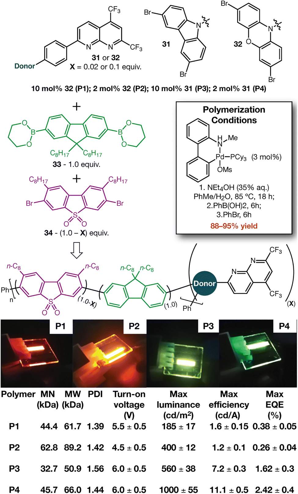 One of our laboratories recently reported the fabrication of host-free OLED devices under air.41 That report used an organic polymer (i.e. “Super Yellow”42) as the emissive layer, so we sought to incorporate 7 into an appropriate polymer. Creating building blocks for polymerization (Fig. 5, 31 and 32) also allowed us to further demonstrate the chemistry of these systems (see SI). We selected the backbone polymer described by Bryce43— which uses fluorene 33 and sulfone 34 as the major components—to incorporate our building blocks by Suzuki polymerization (Fig. 5). Incorporation of 31 and 32 in both low (2 mol%) and high (10 mol%) amounts led to excellent yields of polymer, with emitter loading having a significant effect on emissive properties. Molecular weight analysis of the polymers (at both heterocycle loadings) displayed reasonable MN (32–62 kDa), MW (50–89 kDa), and PDI (1.39–1.56). Our recently described OLED fabrication procedure (with no additional optimization) delivered devices for initial analysis.41 Polymers derived from 31 and 32 show green-yellow and orange-red electroluminescence, respectively (see SI). When compared to previous reports using heptazine acceptors in combination with carbazole44 and phenoxazine45 donors, the observed emission maxima further support the electron deficient nature of these systems.