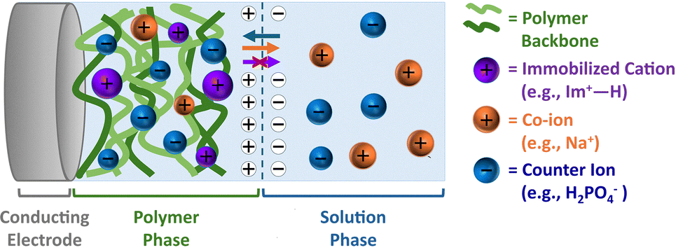 It has not escaped our attention that the ionomeric catalyst coatings reported herein should give rise to a Gibbs–Donnan effect9 and resulting electric potential differences across the polymer and bulk solution phases (see Scheme 2). Immobilized cationic polymer sites (e.g., imidazoliums or pyridiniums) are non-permeable with respect to the boundary between the polymer and electrolyte solution phases. Yet, electroneutrality dictates that fixed-charge sites be accompanied by charge-balancing counter ions. (i.e., anions such as phosphate that possess the opposite charge sign of any fixed, cationic polymer sites). Likewise, any co-ions (i.e., cations such as sodium that bear the same charge sign as any fixed, cationic polymer sites) absorbing into the polymer phase must also be accompanied by charge-balancing counter ions. Thus, when the polymer is exposed to an electrolyte solution, an unequal distribution of ions will arise across the phases. Under this scenario, the resulting Donnan potential would restrict the absorption of co-ions into the polymer phase and counter ion desorption into the electrolyte solution phase. When protons are involved, the pH of the phases can also differ. Under conditions where the concentration of the non-permeable, fixed-charge sites is relatively high (see Table 1), as compared with the concentrations of ions in the bulk electrolyte, the absolute value of the Donnan potential will be relatively high. However, techniques to measure Donnan potentials are scarce, as are reports of measured values.10