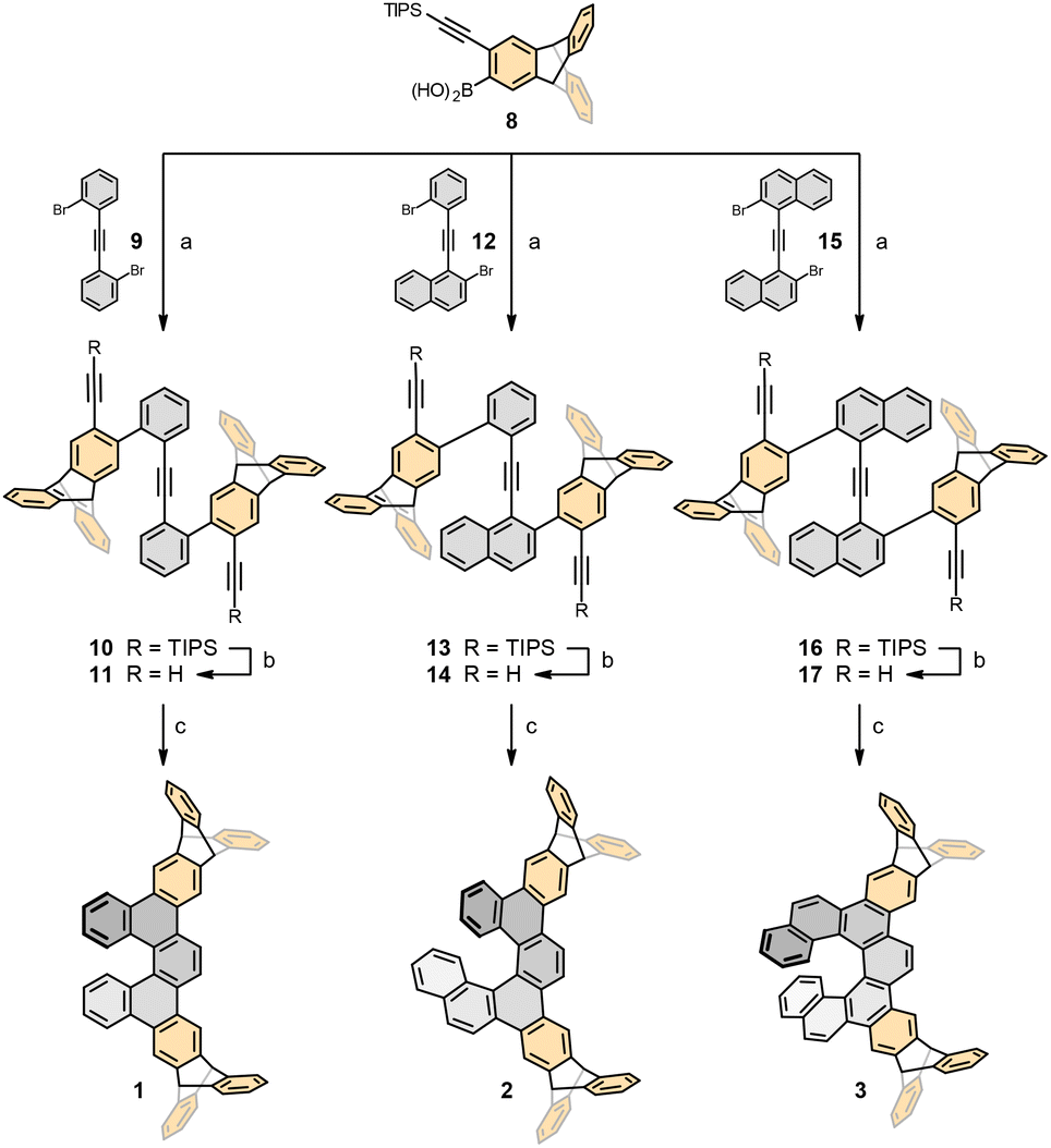 The preparation of racemic ditriptycenohelicenes 1–3 builds on our previously developed synthesis of dibenzohelicenes.24 In this study, we first addressed a straightforward access to o-alkynylated triptycene boronic acid 8 (Scheme 1). In the first step, addition of the aryne generated in situ from 1,4-dibromo-2,5-diiodobenzene 5 to anthracene 4 (both commercially available) furnished bromoiodotriptycene 6 in yields exceeding literature reports.25 After chemoselective alkynylation of 6 with (triisopropylsilyl)acetylene, the bromotriptycene derivative 7 was smoothly converted to the respective boronic acid 8. Thereafter, a unified synthetic sequence delivered ditriptycenohelicenes 1–3 (Scheme 2). First, o-alkynylated triptycene boronic acid 8 was subjected to Suzuki–Miyaura cross-coupling with the homologous tolane-type dibromides 9,26 1224 and 1526 to receive protected triynes 10, 13 and 16 in high yield. Desilylation proceeded smoothly; however, only compound 11 could be routinely purified, as 14 and 17 showed poor solubility. The compound 14 became sparingly soluble after short-column chromatography and solvent evaporation, while 17 precipitated during the reaction. We nonetheless exposed all triynes to RhCl(PPh3)3-catalysed [2 + 2 + 2] cycloisomerisation in chlorobenzene under high-temperature microwave conditions. While 11, being soluble, delivered the target ditriptyceno[5]helicene 1 in good yield, the aggregated triynes 14 and 17 afforded ditriptyceno[6]helicene 2 and ditriptyceno[7]helicene 3 in modest but acceptable yields.