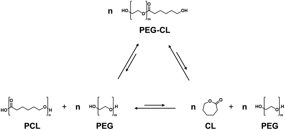 | Scheme 2 Equilibrium relationships driven by transesterification among PCL, CL, and PEG-CL species in a closed system with excess PEG. | ||