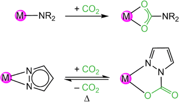 | Scheme 1 Comparison of irreversible CO2 insertion into metal amides (R = alkyl or aryl group) and reversible CO2 insertion into metal pyrazolates. | ||