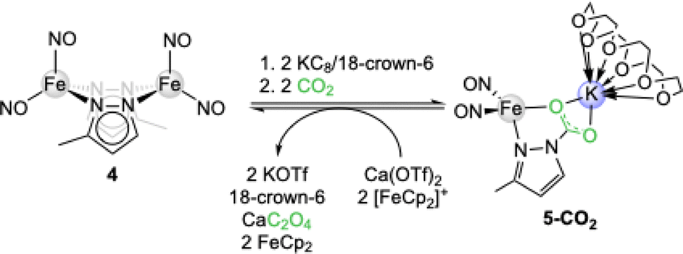 Shortly thereafter, the group of Lu reported on the CO2 insertion into the iron pyrazolate [Fe(pzMe)(NO)2]2 (4). Upon initial reduction of 4 with KC8/18-crown-6 to [K(18-crown-6)]2[(NO)2Fe(µ-pzMe)2Fe(NO)2] (5) exposure to 1 bar CO2 gave the contact ion pair [K(18-crown-6)][Fe(CO2·pzMe)(NO)2] (5-CO2, see Scheme 2).39 Via reductive coupling involving the ferrocenium/ferrocene couple and Ca(OTf)2, 5-CO2 could be converted into CaC2O4, reforming iron precursor 4.