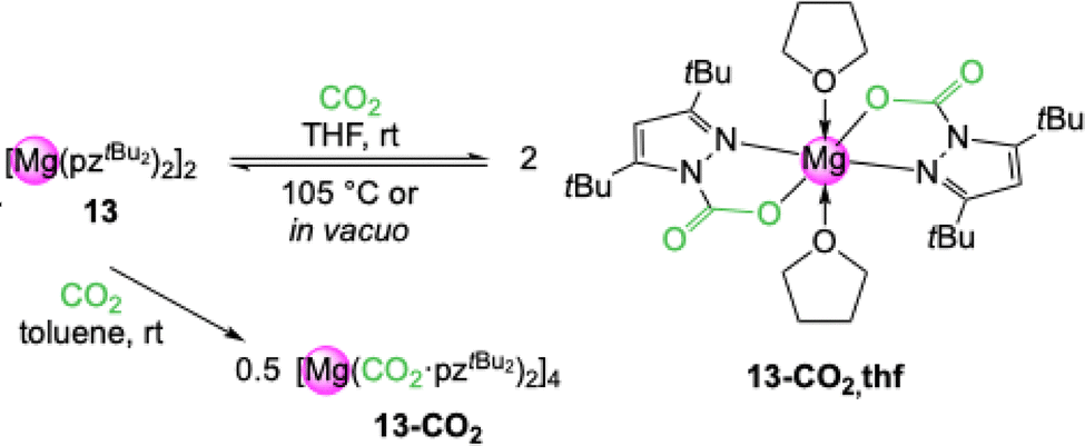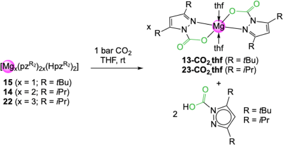 The mixed substituted complex [Mg(pztBu,Me)2(thf)]2 (24) also inserted CO2, but no crystalline material was obtained and the NMR spectra were rather complicated, ruling out the assignment of a precise structure. In contrast, fluorinated [Mg2(pzCF3,CF3)4(thf)3] (25) did not indicate any perceptible CO2 insertion in NMR experiments. It can be hypothesized that the reduced nucleophilicity of the pyrazolato ligand disfavours interaction with CO2.