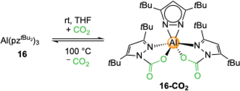 A close examination of the crystal structure revealed that the third CO2 insertion might be hindered by the steric bulk of the tBu groups. The necessary tilt for the insertion of the third pyrazolato ligand is hindered by the two carbamato ligands. The insertion process of complex 16-CO2 is reversible which was proven by a 1H VT NMR study and TGA (Table 2). Striking is that the required energy for the release of CO2 is significantly higher than for the magnesium congener 13-CO2, but also that solid 16-CO2 did not show any de-insertion over time, even under reduced pressure. The less sterically demanding 28 showed complete CO2 insertion to [Al(CO2·pziPr2)3]n (28-CO2) in THF, equaling a capacity of 21.5 wt% CO2. Although no crystalline material was obtained, NMR studies unambiguously revealed full CO2 insertion by showing three distinct signal sets for the carbamato ligands.