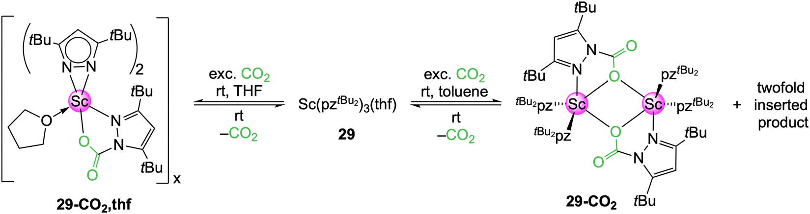 In THF, the scandium complex 29 inserted CO2 only into one Sc–pyrazolato moiety to yield donor-stabilized [Sc(CO2·pztBu2)(pztBu2)2(thf)]n (29-CO2,thf), as detectable in the NMR spectra (Scheme 6).52 However, no crystalline material was obtained, due to immediate CO2 de-insertion at ambient temperature upon solvent removal. This is in stark contrast to the aluminium congener 16-CO2, which did not release CO2 even under reduced pressure. A 1H VT NMR study uncovered a fully reversible equilibrium between 29 and 29-CO2,thf. In toluene, two different insertion species were initially observed in the 1H NMR spectrum. Also, a crystalline material was formed and an SCXRD measurement applying permanent cooling revealed the dimer [Sc(CO2·pztBu2)(pztBu2)2]2 (29-CO2). This equals a CO2 uptake of 7.0 wt%. Complex 29-CO2 could be assigned to one of the two species found in the 1H NMR spectrum. The second species is most likely the twofold inserted [Sc(CO2·pztBu2)2(pztBu2)] (29a-CO2), which immediately releases one CO2 to convert into 29-CO2 upon opening of the NMR tube. An IR spectrum of 29-CO2 could only be obtained with an in situ experiment in an CO2 atmosphere. The overall CO2 affinity (carboxophilicity) of the scandium pyrazolate proved to be rather weak.