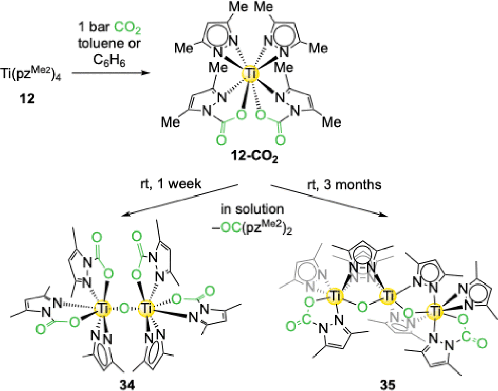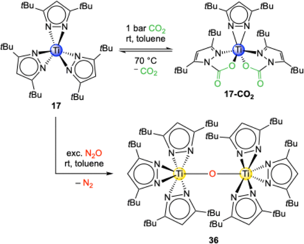 The reaction of the trivalent titanium complex Ti+III(η2-pztBu2)3 (17) with an excess of CO2 led to an immediate colour change from blue over green and yellow to finally red. Surprisingly, the crystal structure revealed that the titanium stayed in the oxidation state of +III and that the complex Ti+III(CO2·pztBu2)2(pztBu2) (17-CO2) formed (Scheme 9).55 Monomeric 17-CO2 is isostructural to the aluminium complex 16-CO2 and thus only two of the possible three pyrazolato ligands inserted a CO2 molecule (13.1 wt% CO2, TGA: 13.9 wt%). Compared to 16-CO2, complex 17-CO2 shows a full release of CO2 already at 70 °C in 1H VT NMR experiments.