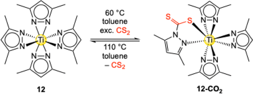Complex Ti+IV(pzMe2)4 (12) is also capable of inserting the related heteroallene CS2.55 The insertion reaction is rather slow under ambient conditions but reached completion after three days at 60 °C. In contrast to CO2, the heavier homologue CS2 only inserts into one of the four possible pyrazolato ligands to afford complex [Ti+IV(CS2·pzMe2)(pzMe2)3] (12-CS2) (Scheme 8).