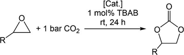 | a Reaction conditions not stated in the table: 0.5 mol% [Cat.] (referred to metal centre), 24 h, neat in epoxide.b Conversion determined by comparison of the proton integrals in the α-position of the epoxide and the corresponding cyclic carbonate (except for tBO where the integral of the tBu moieties was used).c Only TBAB is used as the catalyst. | |||||
