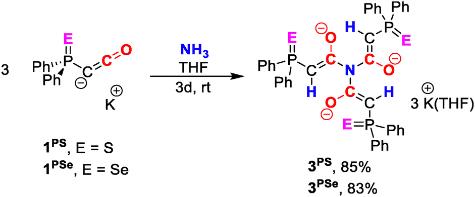 Mechanistically, the formation of 3 is proposed to proceed through an initial proton transfer from ammonia to the ketenyl anion, resulting in the generation of the corresponding protonated ketene and potassium amide (KNH2). The potassium amide subsequently attacks at the carbonyl carbon of the protonated ketene, affording a potassium enolate intermediate. Owing to its enhanced nucleophilicity relative to free ammonia, this intermediate undergoes further reactions with two additional equivalents of the ketenyl anion to yield the final trianionic products 3. The second and third activation steps proceed significantly faster than the initial proton transfer. This conclusion is supported by the observation of a single resonance corresponding to the final product in the 31P{1H} NMR spectrum, with no intermediates detectable under the reaction conditions.