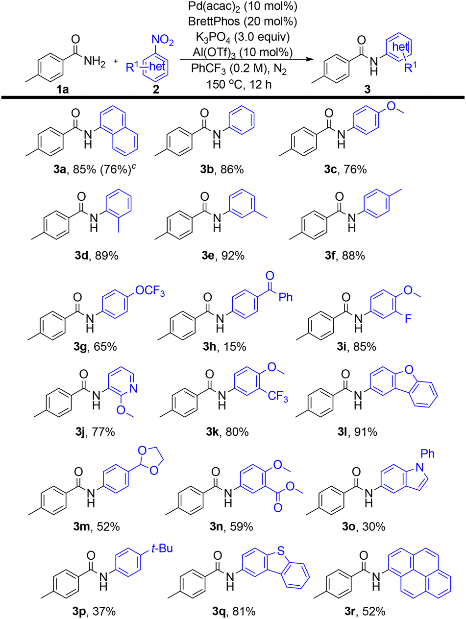 At the outset of this study, p-toluamide (1a) and α-nitronaphthalene (2a) were selected as model substrates to test the reaction parameters. The initial denitrative amidation conducted in toluene (150 °C) with Pd(acac)2 (5 mol%), BrettPhos (10 mol%), and K3PO4 (3.0 equiv.) afforded no detectable product (Table 1, entry 1). Inspired by the work of Dobereiner9 and Stradiotto,14 Al(OTf)3 (10 mol%) was introduced as a Lewis acid additive, and it furnished the coupling product 3a in 37% isolated yield (entry 2). Subsequent optimization revealed K3PO4 to be the optimal base: K2CO3 or Cs2CO3 led to slightly lower yields, while strong bases, namely t-BuOK or DBU, completely suppressed the reaction (entries 3–6). Solvent screening identified PhCF3 as superior to 1,4-dioxane, anisole, and p-xylene (entries 7–10). Ligand evaluation showed that BrettPhos outperformed other biarylphosphines (RuPhos, XPhos, tBuBrettPhos), while imidazo[1,5-a]pyridine-derived NHC ligands (NHC·HCl 1, NHC·HCl 2) also promoted the reaction effectively (entries 11–15). Ultimately, BrettPhos was identified as the optimal ligand. Increasing the loadings of both the catalyst and ligand improved the yield of 3a to 85%, whereas deviations in temperature reduced efficiency (entries 16–18). Under optimized conditions—Pd(acac)2 (10 mol%), BrettPhos (20 mol%), Al(OTf)3 (10 mol%), and K3PO4 (3.0 equiv.) in PhCF3 at 150 °C and a reaction time of 12 h—the coupling product 3a was obtained in 85% isolated yield (entry 16).