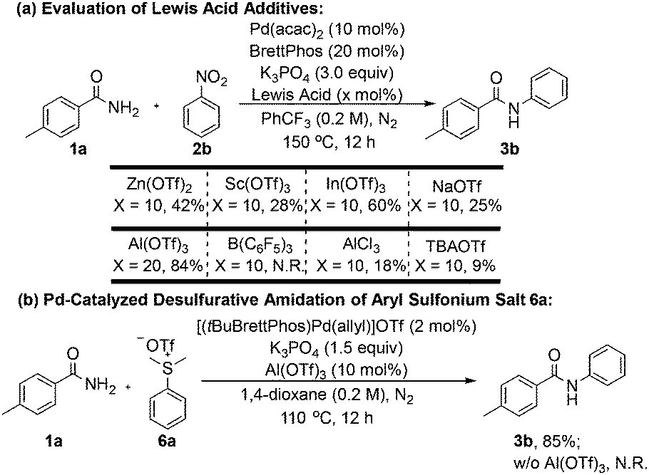 In conclusion, we have developed a Pd-catalyzed denitrative C–N coupling between amide nucleophiles and nitroarenes using a catalytic amount of Lewis acid additives. This transformation employs nitroarenes as electrophilic partners. The Pd–Al cooperative catalytic system effectively inhibits the oxidation of the phosphine ligand. Importantly, the Lewis acid not only functions as an anion abstractor but also likely interacts with the amide substrate to form a catalytically active complex, accelerating the transmetalation step and preventing the formation of the inactive κ2-amidate species. Moreover, metal triflate additives may exert additional beneficial effects; further studies are required to elucidate their mechanistic role in Pd-catalyzed denitrative cross-coupling reactions.