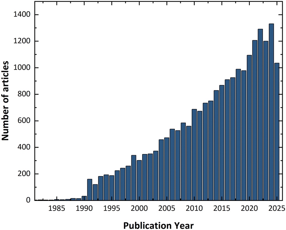 | | Fig. 4 Number of articles published over the years. Data obtained by searching the Web of Science™ database for the keyword “crystal structure prediction” (accessed 2025). | |