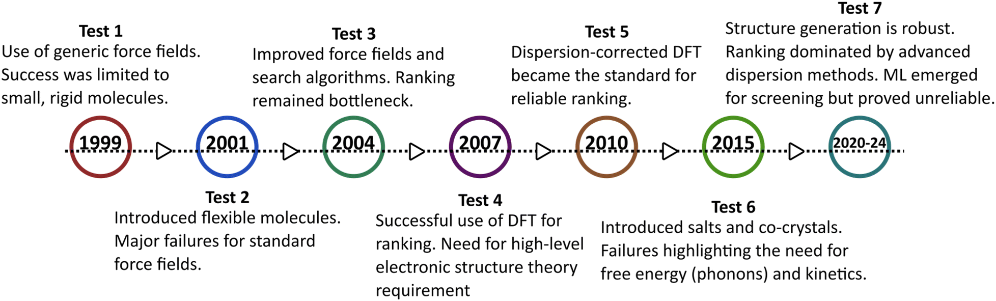 | | Fig. 6 Timeline of the CCDC blind tests illustrating the evolution of CSP methodologies. The progression highlights the transition from empirical force fields (tests 1–2) to the adoption of DFT for energy ranking (tests 4–5), while the most recent tests (6–7) demonstrate the standardization of dispersion-corrected DFT as the benchmark for stability prediction. | |