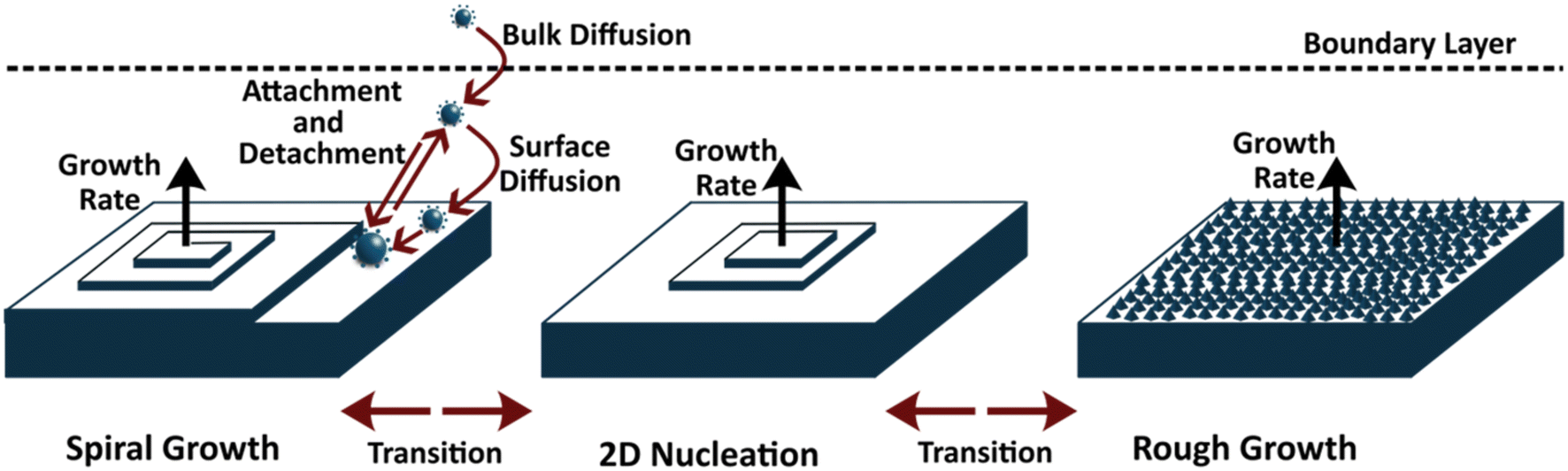 Nucleation establishes a structural template for subsequent crystal growth. During growth, the periodic arrangement of molecules evolves, and crystal faces with slower growth rates become dominant in the final morphology. Faces that grow rapidly disappear from the equilibrium shape (morphology, habit, and shape are used interchangeably in the literature). It is well established that the level of supersaturation determines the prevailing growth mechanism, such as spiral growth, two-dimensional (2D), or rough growth.26 Controlling crystal growth is crucial because the shape evolution directly influences material performance. For instance, in optical or electronic applications, macroscopic crystals with smooth, defect-free surfaces are desired, whereas in pharmaceutical manufacturing, microscopic crystals with a higher specific surface area provide enhanced dissolution rates and bioavailability.27 Thus, understanding the interplay between supersaturation, nucleation, and growth mechanisms is essential for tailoring crystals with targeted properties across disciplines from materials science to pharmaceutical engineering.