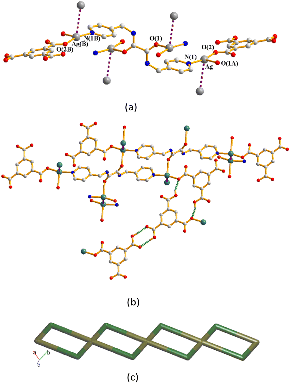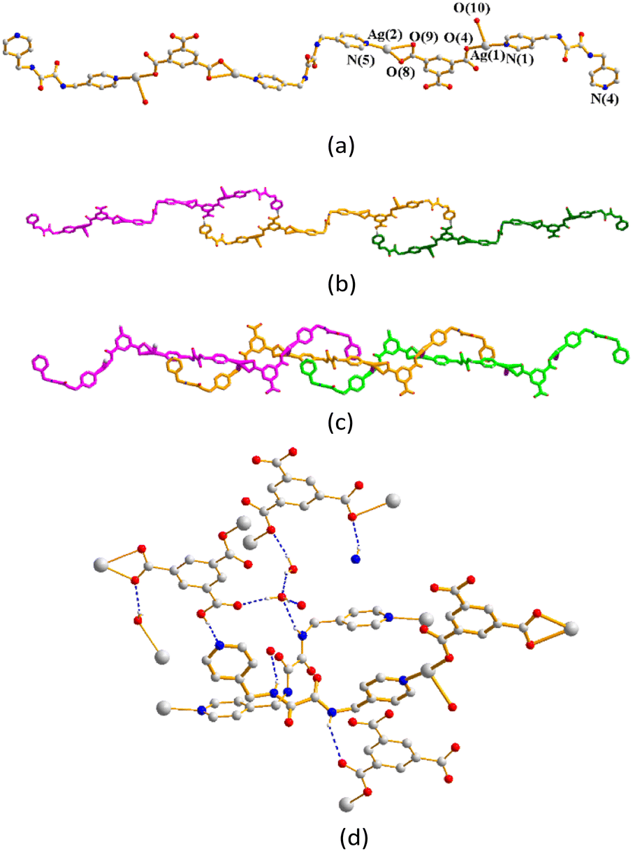 While many Ag(I) CPs with mixed ligands involving dipyridyl and polycarboxylate ligands have been reported, the coordination of the polycarboxylate ligands to Ag(I) ions remain unjustified, presumably due to the hard base character of the polycarboxylate ligands and the soft acid character of the Ag(I) ion. Short Ag⋯Ag and Ag⋯O distances were observed in the structurally characterized complexes with bridging ligands (ligand-supported) and the attractive phenomenon of Ag⋯Ag interactions was generally accepted after examples of ligand-unsupported ones were reported.25 The Ag⋯Ag distance is generally longer than that of the metallic Ag⋯Ag contact (2.89 Å), but shorter than the van der Waals contact distance (3.40 A°), whereas the Ag⋯O distances are longer than the upper limit of 2.3–2.6 Å for Ag–O bonds,26 but are significantly shorter than the corresponding van der Waals contacts of Ag and O atoms which is 3.24 Å (van der Waals radii for Ag = 1.72 and O = 1.52 Å).27 The Ag⋯O distances to the polycarboxylate anions are thus important in determining the structural topologies of the Ag(I) CPs thus prepared and should be carefully evaluated.
