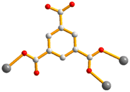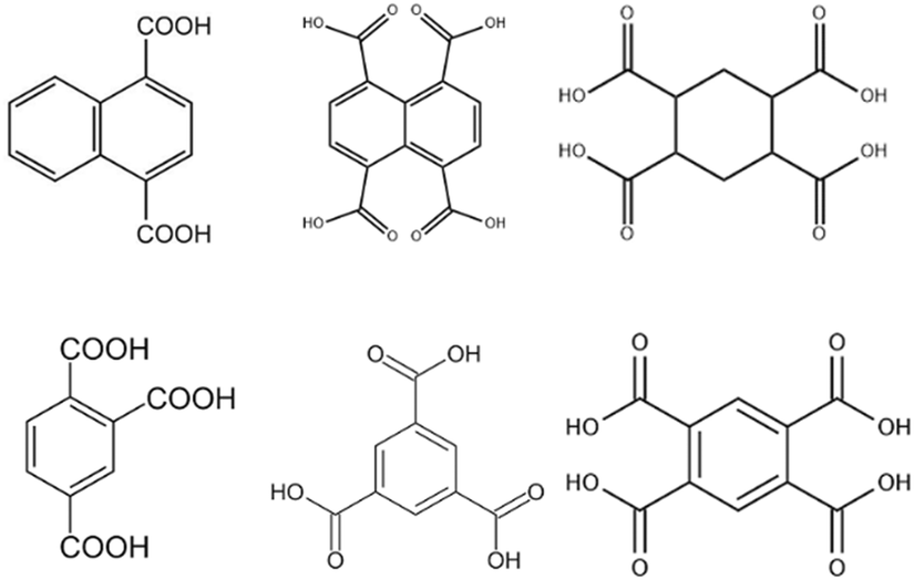 | | Fig. 2 From left to right, first row: structures of 1,4-H2NDC, 1,4,5,8-H4NTC and 1,2,4,5-H4CTC. Second row: 1,2,4-H3BTC, 1,3,5-H3BTC and 1,2,4,5-H4BTC. | |