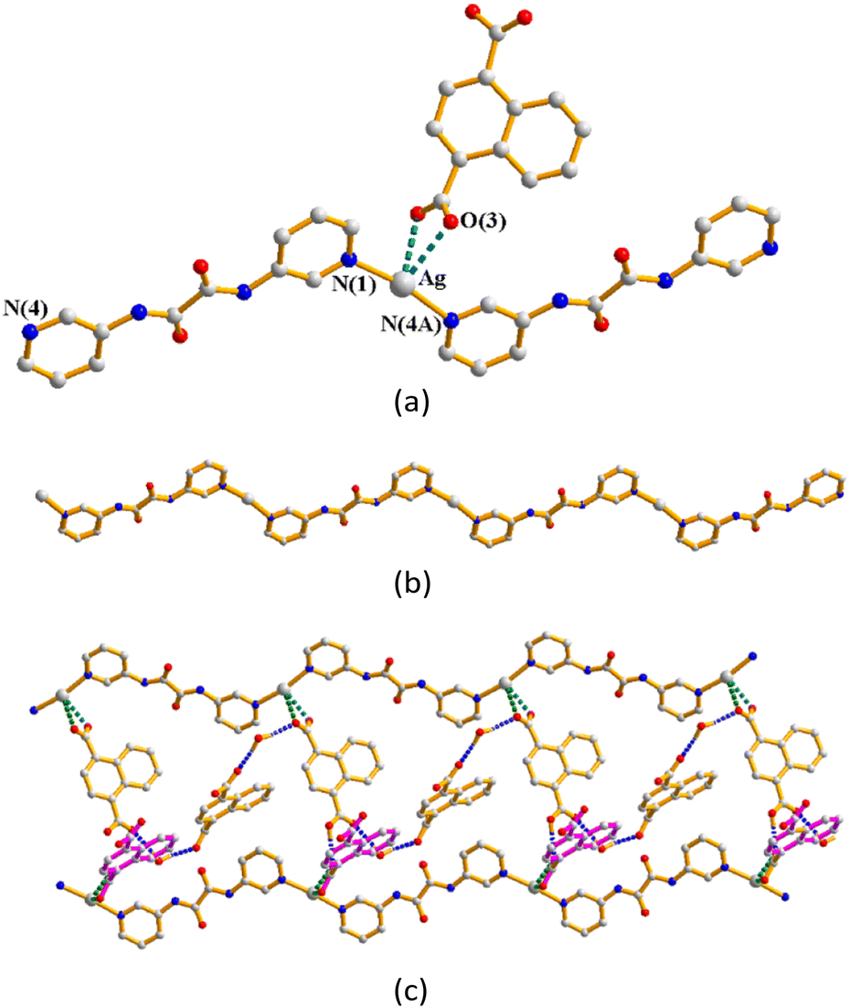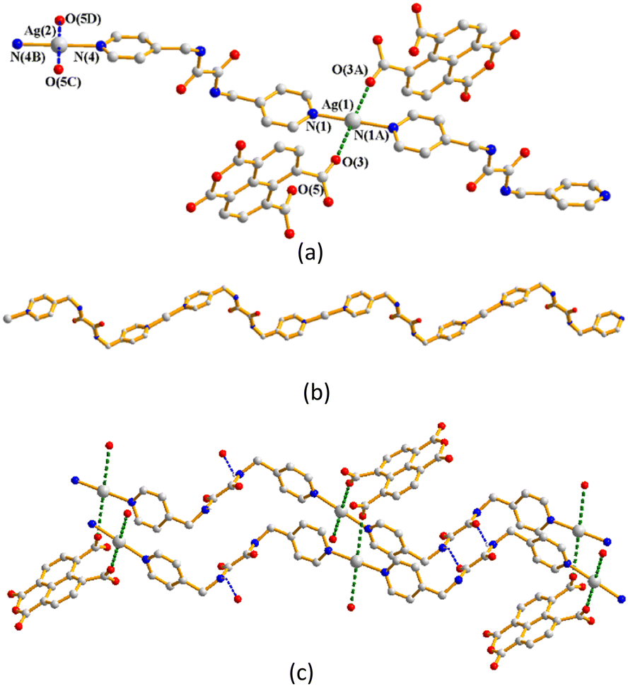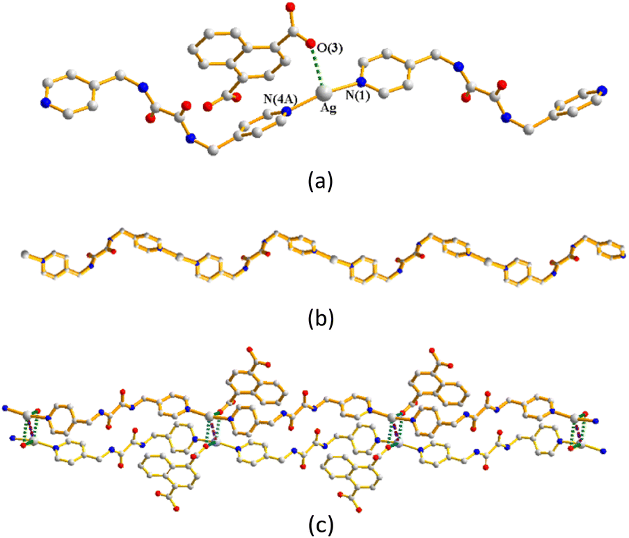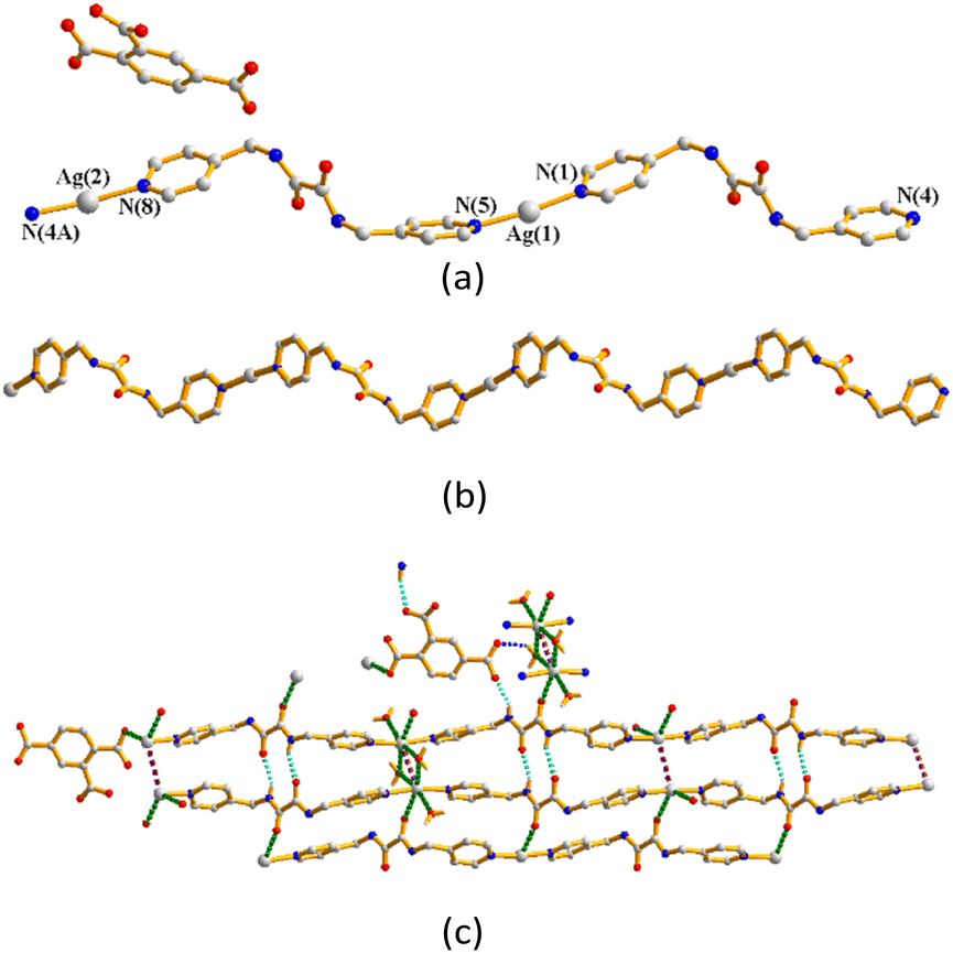 The rational design and synthesis of novel coordination polymers (CPs) have become an active area of investigation because such that the range of these crystalline functional materials with pre-selected physical and chemical properties can be further expanded.1–11 The varieties of the CPs that can be approached rely on the presence of suitable metal–ligand interactions and supramolecular contacts, i.e., hydrogen bonds and other weak interactions. The properties of CPs are mostly dominated by their structures and compositions and it is well known that the structural type of CPs is determined by several factors such as the identities of metal ions, counter ions and organic linkers.12–15 Therefore, controlling the appropriate factors to construct suitable CPs have become an exciting topic in the crystal engineering of CPs. On the other hand, Ag(I) CPs have attracted great attention due to their structural variability and extensive industrial and medical applications.16–24