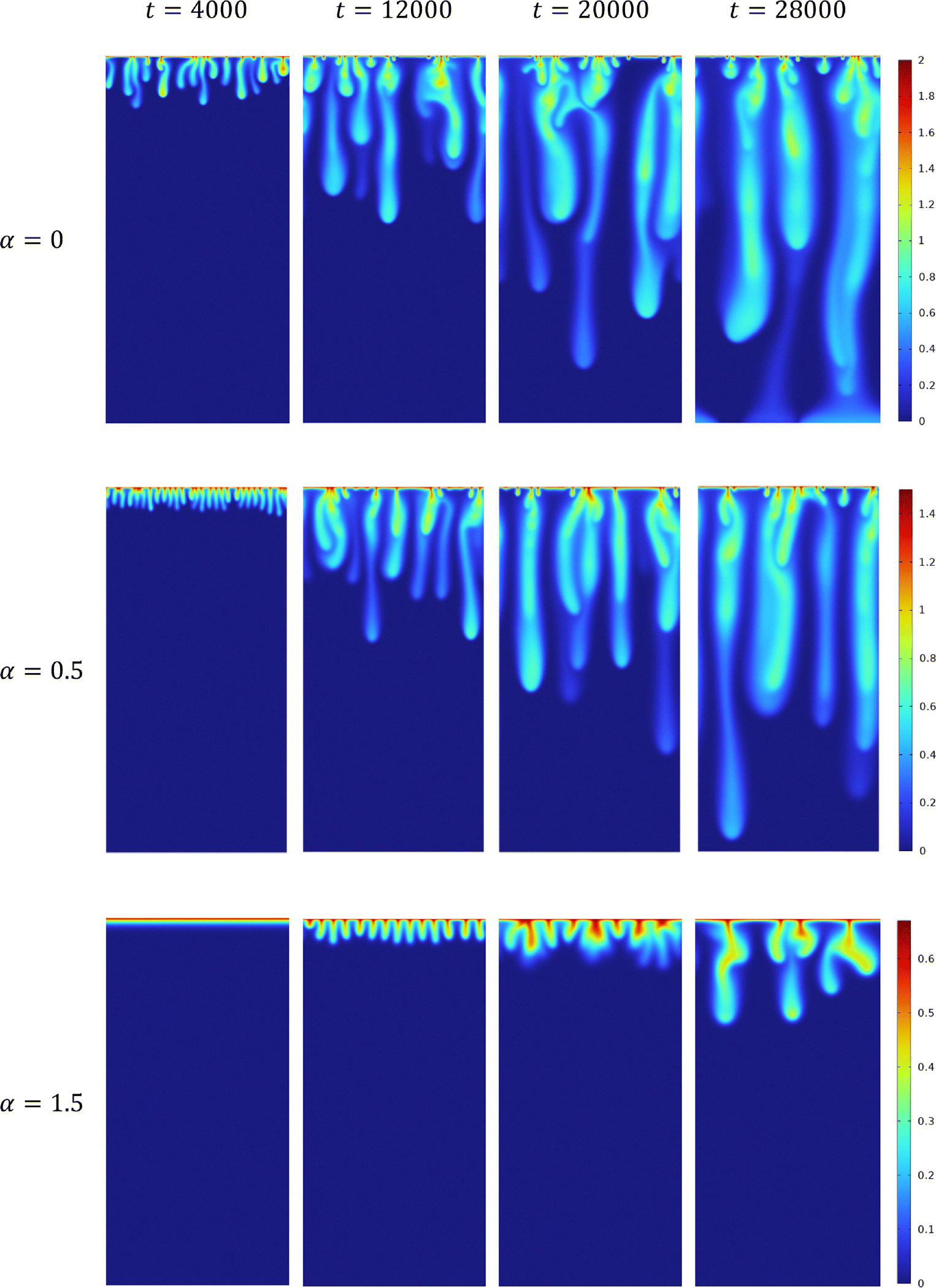 The influence of the variable solubility of A on the density distribution is presented in Fig. 2 for three different values of α. For any nonzero value of α, the dynamics are more stable than the corresponding reactive case with α = 0. Indeed, it has been shown in a reaction–diffusion system that when α > 0 increases, the reaction front invades the host phase more slowly.63 Consequently, A and C are smaller at a given depth z while B is larger. The density field being directly correlated to the concentration fields through eqn (11), increasing α leads to a decrease of ρ, which stabilizes the dynamics compared to the α = 0 case.