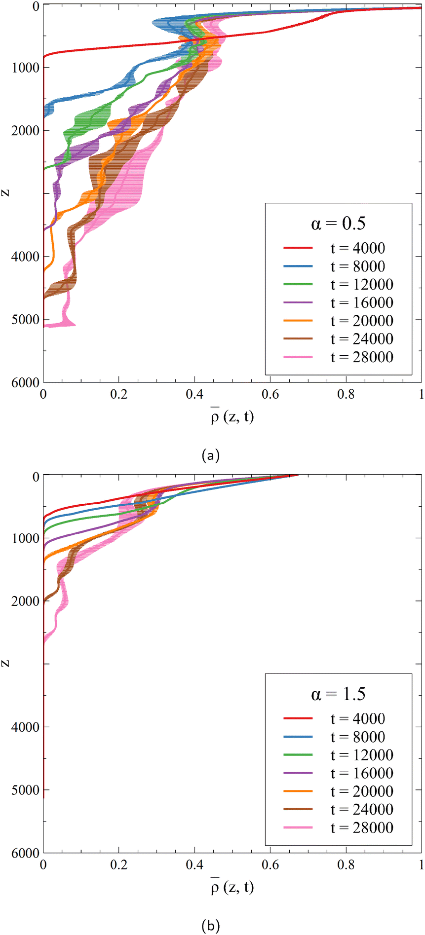 Fig. 3 Horizontally-averaged density profiles of the 2D dynamics of Fig. 2 at different times for (a) α = 0.5 and (b) α = 1.5. Note that the maximum values of the density in the host phase, obtained at the interface (z = 0), are max = 1.50 when α = 0.5 and max = 0.67 when α = 1.5. Each curve is averaged over 10 simulations, for which the standard deviation is shown. | ||