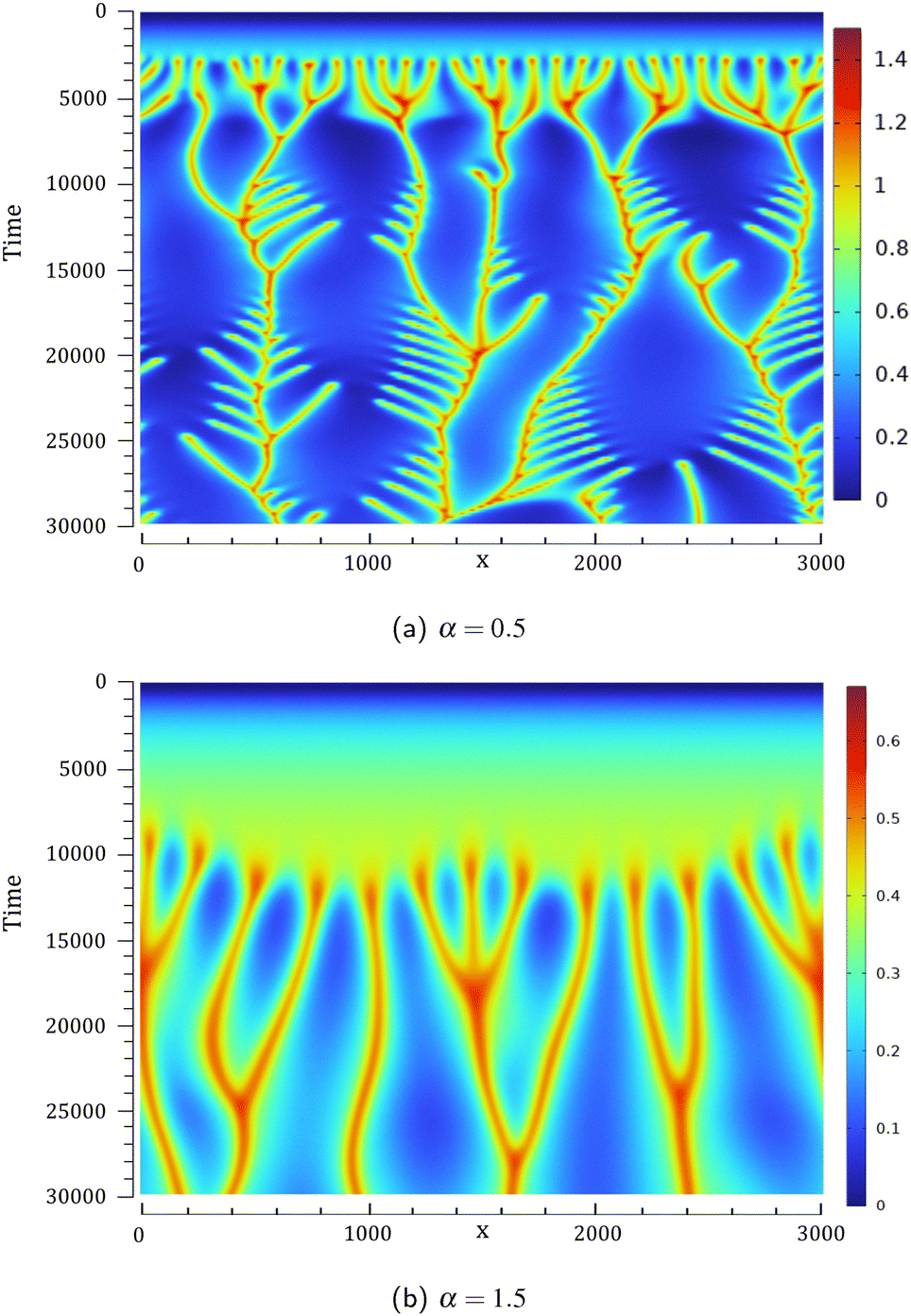 | Fig. 4 Space-time plots of the density computed at a horizontal line at z = 64 below the interface for the unstable reactive cases of Fig. 2 with (a) α = 0.5 and (b) α = 1.5. The density scale varies from 0 (blue) to its maximum value (red). | ||