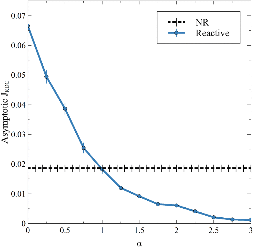 Fig. 10 Asymptotic (25 000 ≤ t ≤ 30 000) averaged RDC flux of A for different values of α and β while ΔRCB = 1. Each point is averaged over 10 simulations, for which the standard deviation is shown. | ||