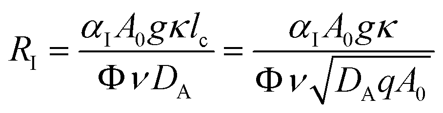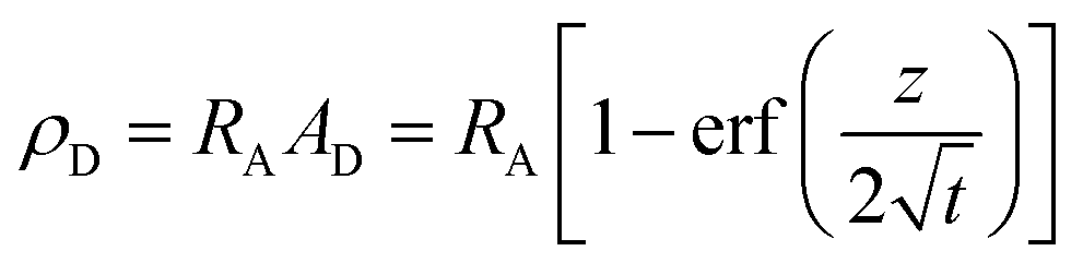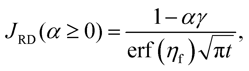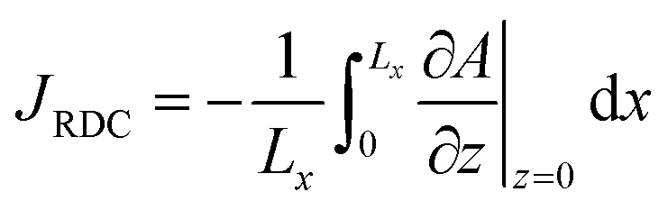 To quantify the storage rate of A into the host phase, we compute the temporal evolution of the dissolution flux of A through the interface. Eqn (14) present the known solutions of the flux: JD is the analytical diffusive flux of A in absence of reaction and convective dynamics; JRD is the reaction–diffusion flux that can be computed analytically when α = 0 or numerically when α ≥ 0 in absence of convection;63 the RDC flux of A is computed numerically using eqn (14d).