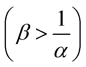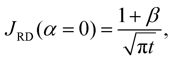, increasing β enhances the influence of the reaction on the mass transfer which results in an increase of JRDC, because the concentration gradient increases. Once the reactant B is in excess (β > 1/α) the flux is not influenced by β any longer, the reaction being limited by the solubility of A and not by the initial amount of B anymore. Conversely, increasing β decreases the mass transfer for all values of α > 1. The product strongly decreases the solubility of A in these cases, hence the reaction is quickly limited by A and the asymptotic flux is again not influenced by β once