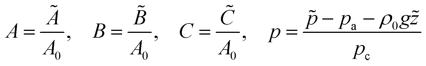 where DA is the diffusion coefficient of A. A0, used to non-dimensionalize the concentrations A, B and C, is the solubility of reactant A in the initial solution of B with concentration B0 when C = 0. We also use the velocity scale