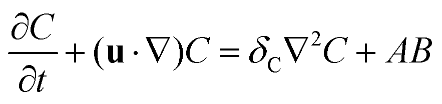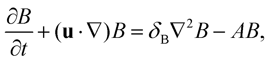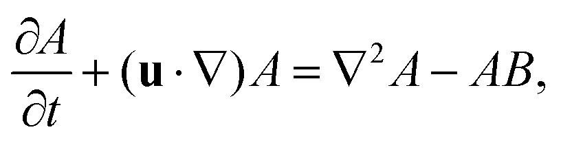 If all species diffuse at the same rate, i.e. δB = δC = 1, summing eqn (2b) and (2c) with the given boundary and initial conditions evidences the conservation relation:12,54B + C = β. Thanks to this relation, we can reduce the number of dimensionless parameters by defining the dimensionless density ρ as