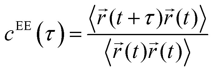 To understand the relationship between the average translational diffusivity and the conformational kinetics of the polymers in a condensate, we computed a polymer end-to-end distance vector's time correlation function as follows:| |  | (6) |