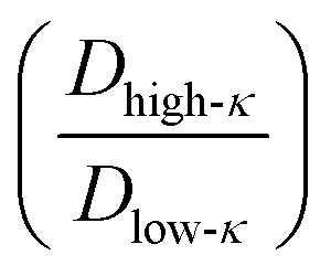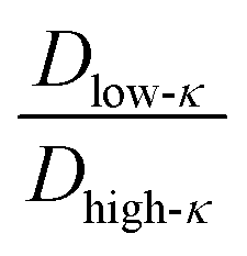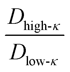 showed a steady decrease as xlow-κ increased at Δκ = 0.86 and 0.54, while at Δκ = 0.30 there was no dependence on the mixing fractions. The ratio of the bulk phase to droplet diffusivity decreased from 20-fold to 10-fold within xlow-κ = 0.1 to 0.9 at a constant T/Tc = 0.2, showing that there was an enhanced mobility alongside an enrichment of the low-κ polymers, and this ratio was correlated to the variation in the critical point, as shown in Fig. 2B, which exhibits a linear relationship with the stability of the dense phase. Comparatively,