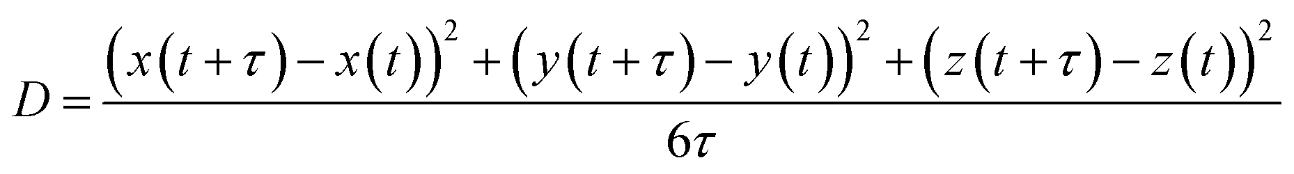 To quantify the internal dynamics within the heterotypic condensates, we measured the diffusion coefficients of the high and low-κ polymers within the droplets at different temperatures as they approached criticality. The diffusion coefficients were evaluated as the slope of the mean squared displacement (Fig. S4 for the MSD of the polymers in the droplet phase), and were computed using the equation:| |  | (5) |