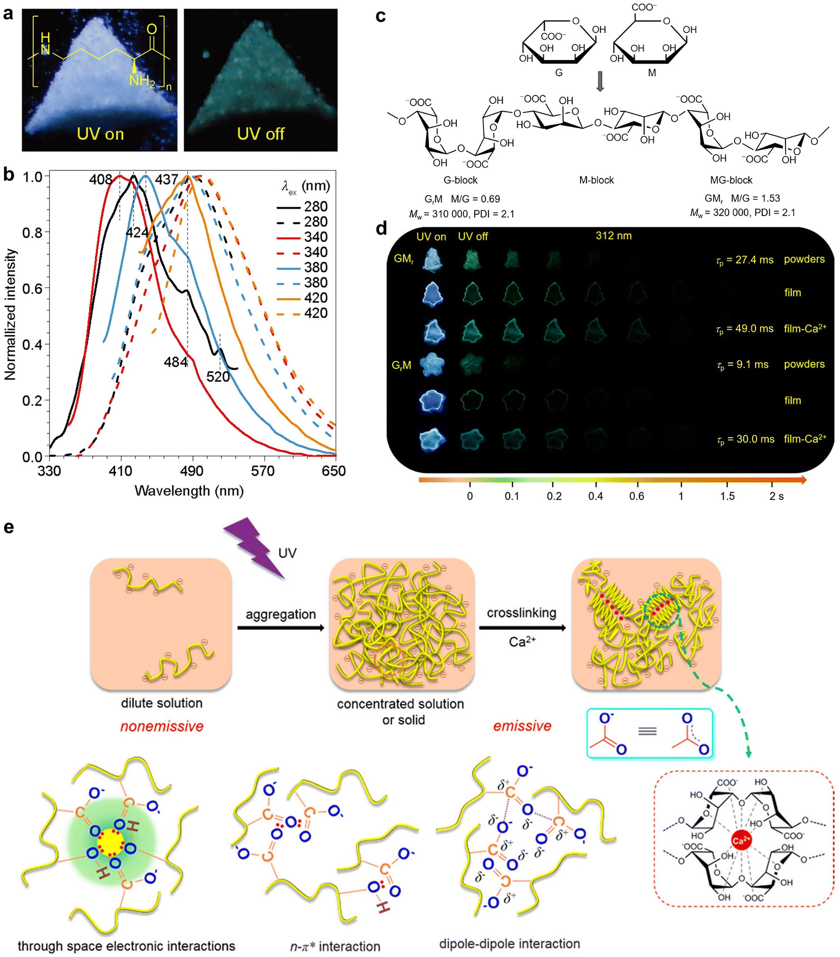 In addition, following the intrinsic visible emission of amino acids, RTP of poly(amino acid) was also observed and reported by Yuan et al. in 2017.422 Similar to the phenomenon of CL, several amino acids (e.g., L-glycine, L-alanine, L-serine, L-arginine, and L-lysine) are non-emissive in dilute solution, but their concentrated solutions and crystalline forms can emit blue or green light under UV irradiation with varying PLQY of 0.1–7.4%. Persistent phosphorescence from their solid samples at 77 K after ceasing the irradiation is also observed, which is previously believed to be exclusively stemming from aromatic systems. Inspired by this behavior, they further studied the photophysical properties of their corresponding polymers and detected the RTP from ε-poly-L-lysine (ε-PLL). As a solid power, ε-PLL exhibits excitation-dependent fluorescence around 410–490 nm with the highest PLQY of 7.9% (Fig. 53a and b). With a delay time of 0.1 ms, green RTP at 490 nm is measured, indicating its rigid conformation assisted by the polymeric chain effect and multiple intra- and inter-molecular interactions. Besides, similar behavior was observed in the biomacromolecular luminogen of sodium alginate, a plant-derived anionic polysaccharide with a similar composition to starch.120,336 Since the α-L-guluronic acid (G) and 1,4-linked β-D-mannuronic acid (M) residues show different rigidity, two typical chain sequences of GMr (∼1.53 M/G blocks) and GrM (∼0.69 M/G blocks) exhibit different RTP properties (Fig. 53c). Although they display blue-white fluorescence and green RTP, GMr processes a longer phosphorescent lifetime of 27.4 ms than GrM of 9.1 ms because the G block is stiffer and more sterically hindered. Due to the high ion-binding ability, the RTP lifetimes could be further adjusted by Ca2+ ions. Accordingly, the lifetimes of film-Ca2+ GMr and film-Ca2+ GrM extended to 49.0 ms and 30.0 ms, respectively (Fig. 53d). Based on these results, the photophysical properties and working mechanism of SA are summarized, which are closely related to the clustering of oxygen atoms and carboxylates (Fig. 53e).423 Isolated molecules in dilute solution are non-emissive due to a lack of rigidity, but clustering upon concentration or aggregation facilitates O⋯O, C