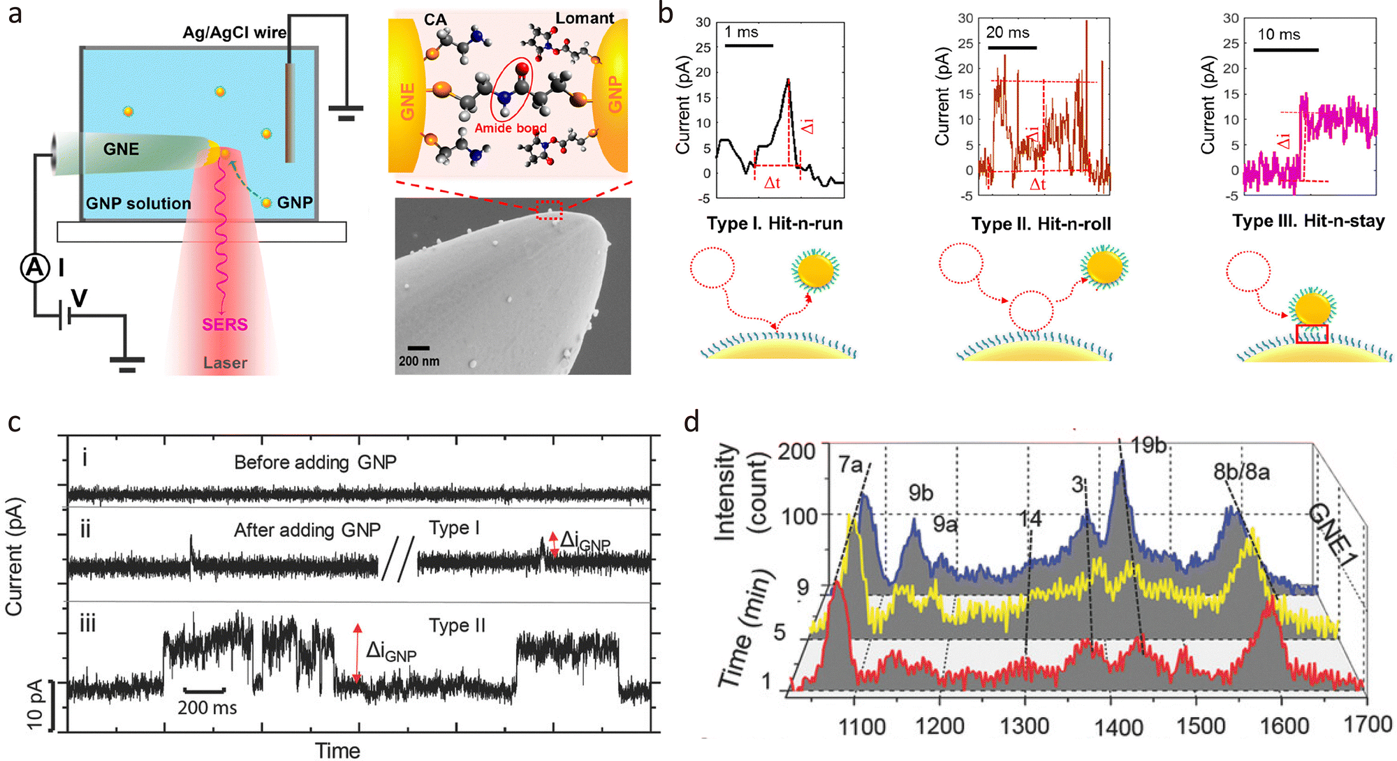| Fig. 10 Passive junctions. (a) The schematic demonstrates the experimental setup for SER measurements during the formation of a passive junction. The SEM demonstrates that the Au nanoparticles (GNP) are absorbed on the SAM-modified Au nanoelectrode surface to form a GNP-SAM-GNE collision junction. (b) Three main dynamic behaviours of nanoparticle collision on the GNE and typical current–time response. (c) Real-time current–time traces and (d) SERs response of nanoparticle collision process. Panel (a) and (b) is reprinted with permission from ref. 125, Copyright (2021), American Chemical Society. Panel (c) and (d) is reprinted with permission from ref. 128, Copyright (2018), Wiley-VCH Verlag GmbH & Co. KGaA, Weinheim. | ||