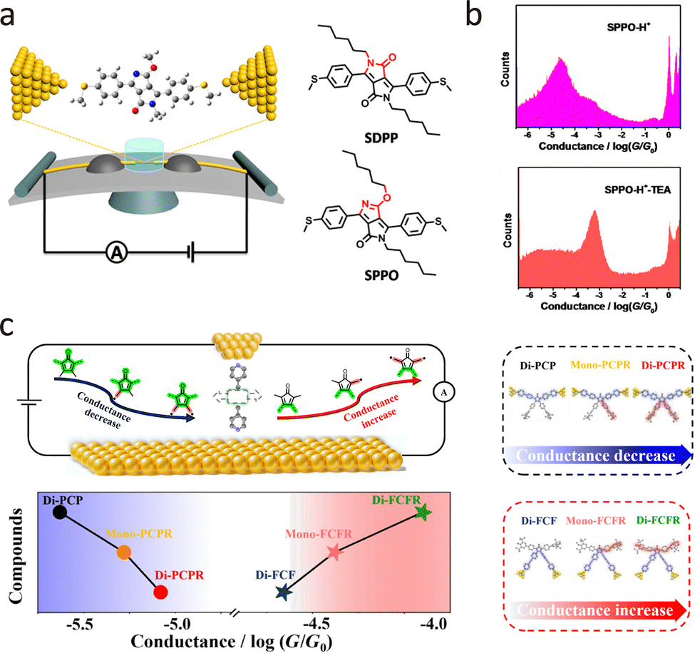 | Fig. 11 (a) Schematic illustration of DPP junctions created by the MCBJ platform and the corresponding molecular structures of DPP isomers. (b) Conductance histograms of SPPO-H+ junctions and SPPO-H+-TEA junctions showing reduced conductance values for protonated SPPO. (c) Schematic diagrams of the progression of single-molecule conductance for PCP and FCF junctions with radical injection. Panels (a) and (b) are reprinted with the permission from ref. 160, Copyright (2018), American Chemical Society. Panel (c) is reprinted with the permission from ref. 163, Copyright (2024) by Hanjun Zhang, under CC BY-NC 4.0 license. | ||