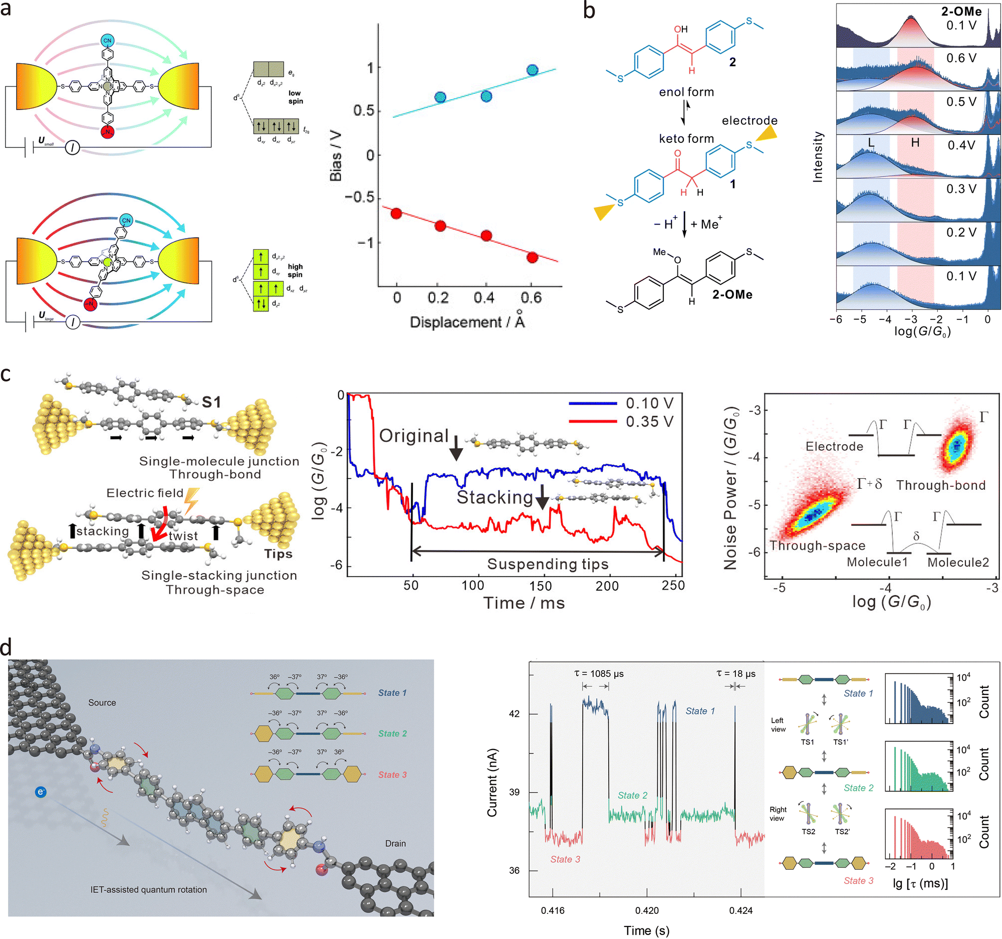 | Fig. 12 (a) Schematic diagrams of the voltage-induced single-molecule spin switch, demonstrating the dominant role of the ligand's dipole moment in the spin switching process. Right panel: The evolution of the bistable transition voltage with electrode spacing shows that the electric field threshold remains constant. (b) Molecular structure of the compound with the enol tautomeric unit as the centre and its keto isomer. Right panel: 1D conductance histograms of the keto compound across biases from 0.1 to 0.6 V, revealing a voltage-induced shift from low-conductance (L) to high-conductance (H) states. (c) Schematic illustration of the single-terphenyl junction and the terphenyl-stacking junction. Typical conductance traces of terphenyl junctions at 0.10 V and 0.35 V indicate conductance changes during stretching. A 2D histogram of noise power versus average conductance highlights differences in noise characteristics between the single-terphenyl junction and the terphenyl-stacking junction. (d) Schematic illustration of the single-molecule junction with a hexaphenyl aromatic molecule covalently embedded in graphene electrodes, illustrating the quantum rotation effect. The typical I–t curve and dwell times of three states suggest two conversion pathways with different rates. Panel (a) is reprinted with permission from ref. 166, Copyright (2015), Wiley-VCH Verlag GmbH & Co. KGaA, Weinheim. Panel (b) is reprinted with permission from ref. 167, Copyright (2023), Springer Nature. Panel (c) is reprinted with permission from ref. 168, Copyright (2020), American Chemical Society. Panel (d) is reprinted with permission from ref. 169, Copyright by Yilin Guo (2025), under CC BY-NC 4.0 license. | ||