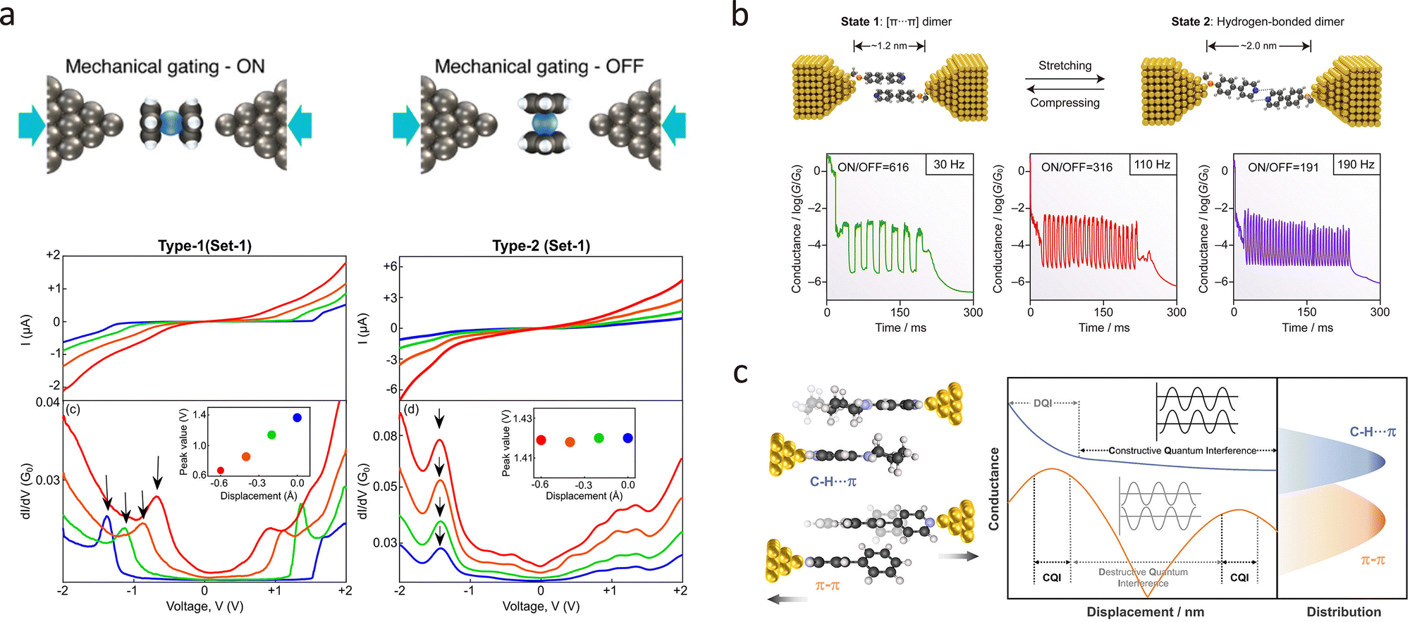 Mechanical force has also proven effective in probing intermolecular interactions. By stretching or compressing the junction, researchers can modulate the degree of stacking of conjugated molecules, alter charge-transport pathways in supramolecular assemblies, and even observe quantum-interference oscillations. Recently, Zhou et al. constructed robust single-supermolecule switches by harnessing two different non-covalent interactions between pyridine derivatives.178Fig. 13(b) demonstrated that the conductance is high when the phenylene-pyridine backbone forms face-to-face [π⋯π]-stacked dimers upon junction compression. In contrast, upon junction stretching, the formation of double [C–H⋯N] hydrogen bonds between neighbouring pyridine units leads to a significant decrease in conductance. These switches operated reliably at frequencies up to 190 Hz, demonstrating excellent reproducibility. Additionally, Zhou et al. investigated the charge transport properties of supramolecular junctions formed by C–H⋯π and π–π interactions, as shown in Fig. 13(c).179 Their findings revealed that C–H⋯π interactions enable more efficient charge transport than π–π stacking, with conductance measurements showing C–H⋯π junctions exhibit approximately 350% higher conductance. The study also revealed that the conductance of C–H⋯π junctions initially decreases with stretching and then gradually stabilises, unlike the periodic fluctuations observed in π–π stacked junctions. Theoretical analysis attributed this behaviour to a transition from destructive to constructive quantum interference in C–H⋯π interactions as the junction is stretched.