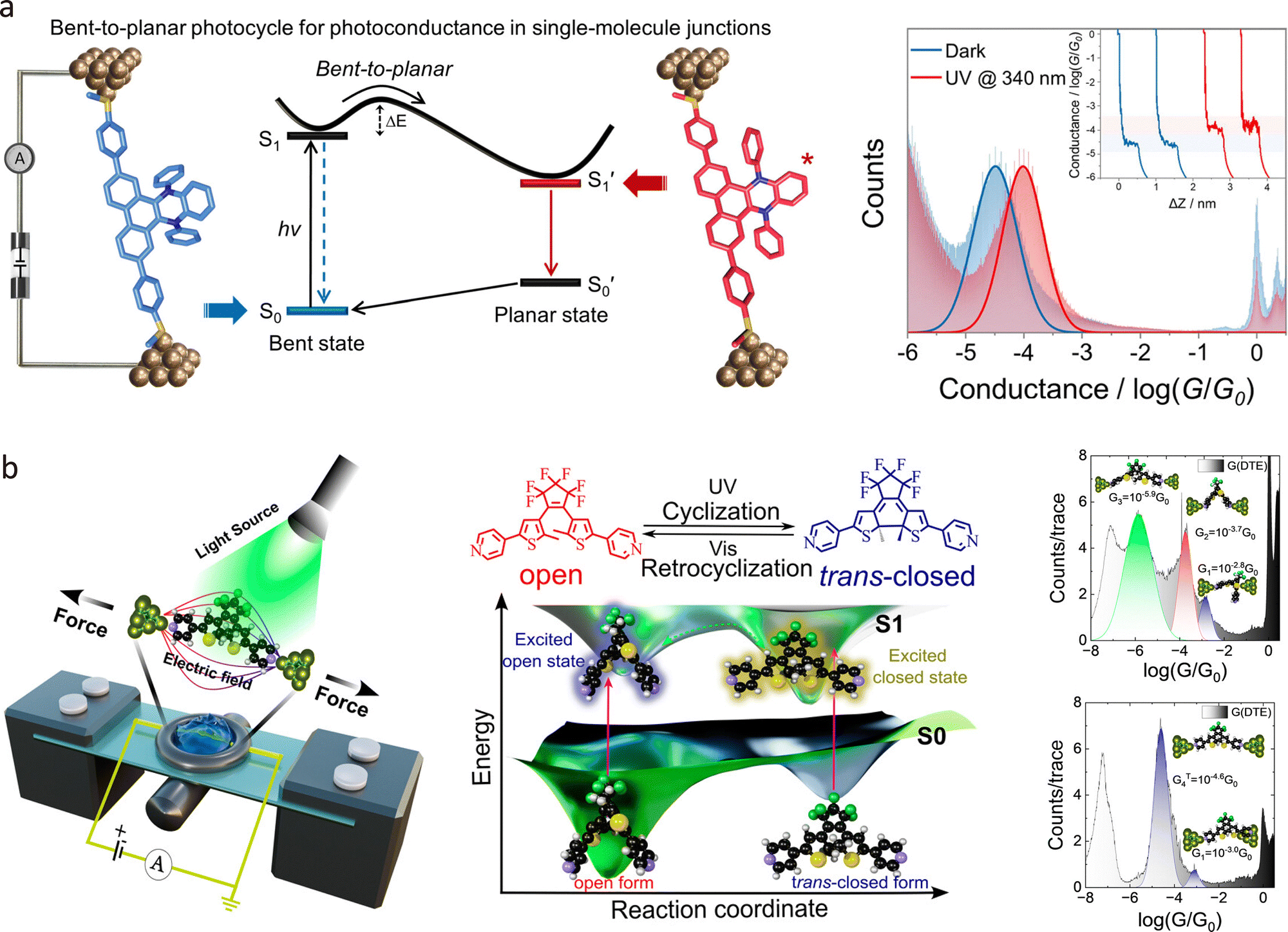 In addition to directly photoresponsive molecules, light can also induce electronic excitation that drives conformational changes in non-photochromic systems. As shown in Fig. 24(b), Cai et al. reported a light-driven, reversible intermolecular proton transfer at single-molecule junctions using a diarylethene–pyridine supramolecular pair.261 By combining STM-BJ conductance measurements with UV irradiation, the distinct switching behaviour of diarylethene–pyridine is attributed to proton transfer modulated by light-induced conformational changes. Moreover, the open and closed forms of diarylethene influence hydrogen bonding and proton affinity, enabling controlled proton shuttling between donor and acceptor. Apart from observing light-driven open and closed forms of molecules, Tan et al. investigated the conductance evolution of photoisomeric single-molecule junctions under continuous UV irradiation using diarylethene derivatives in an STM-BJ setup.262 As shown in Fig. 24(c), they observed dynamic transitions from high- to low-conductance states, corresponding to isomerisation from the trans to the cis geometry. Real-time conductance monitoring reveals stochastic switching events and intermediate states, highlighting the role of UV exposure duration and intensity in modulating the distribution of isomers.