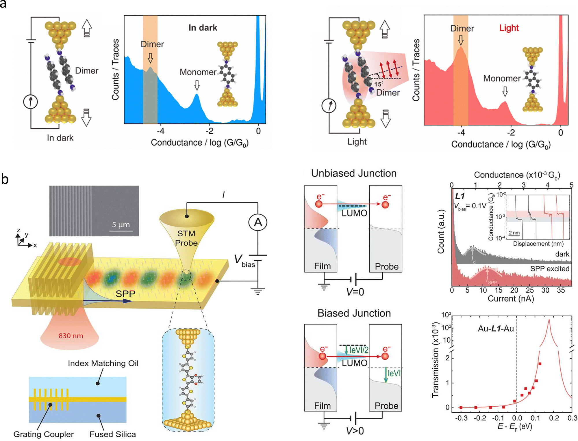 When a metal nanogap is illuminated at its resonance wavelength, it can excite the localised surface plasmon resonance (LSPR), resulting in enhanced local electromagnetic fields, the generation of hot carriers, and localised thermal effects. Depending on different phenomena, various effects can be produced on the structure and properties of molecular junctions. Recently, it has been shown that the electromagnetic field enhancement induced by LSPR can be utilised to generate optical gradient forces within tunnelling junctions, thereby capturing molecules in the vicinity of the nanogap, enabling single-molecule plasmonic optical tweezers.184,185 Very recently, Xu et al. investigated the π–π interactions between single molecules using the STM-BJ technique.186 As shown in Fig. 15(a), they employed 2,6-naphthalenediamine (2,6-NA) molecules, which have two amino anchoring groups and naphthalene as the backbone to form π–π stacking dimers. Conductance measurements of thousands of single-molecule junctions revealed distinct peaks in 1D and 2D conductance histograms, corresponding to molecular monomer and dimer junctions. Under laser illumination (λ = 532 nm, intensity ∼1 × 104 Wm−2), the low-conductance peak, attributed to dimer junctions, exhibited a significant rightward shift and intensity increase, while the high-conductance peak remained largely unchanged. This indicated enhanced π–π coupling between molecules under light. Furthermore, flicker noise analysis was performed, demonstrating that the flicker noise power-scaling factor decreased upon illumination, supporting the enhanced π–π coupling. Analysis based on finite-element and a quasi-quantum method revealed that the enhanced π–π interaction originated from the optical gradient force within the nanogaps. This study provides a non-destructive method for regulating π–π interactions at the single-molecule level.