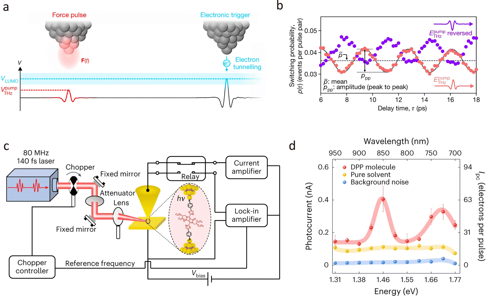 Another emerging research direction in single-molecule optoelectronics is to couple ultrafast light with molecular junctions, thereby obtaining high spatiotemporal-resolution information through electrical measurements. In 2016, Cocker et al. proposed tracking the ultrafast motion of a single pentacene molecule using femtosecond orbital imaging with THz-STM.191 The team demonstrated selective tunnelling through the HOMO of a pentacene molecule within a sub-cycle time window, removing a single electron in approximately 100 femtoseconds. Furthermore, they revealed coherent molecular vibrations at terahertz frequencies via pump/probe measurements. This work enabled the visualisation of ultrafast photochemical processes and molecular electronics at the single-orbital level, offering insights into molecular electronic and vibronic dynamics with atomic precision and ultrafast temporal resolution.192,193
