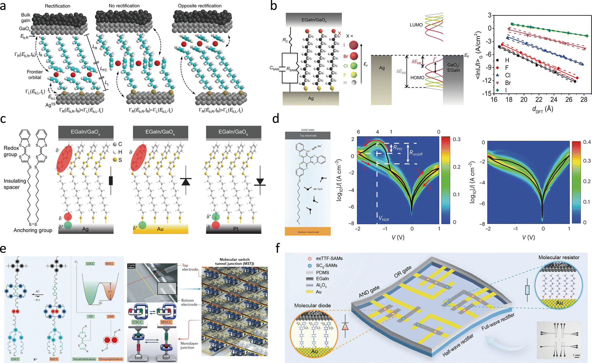 | Fig. 18 (a) The schematic illustration of the position of the Fc molecule in AgTS-SCnFcC13−n//Ga2O3/EGaIn junction leads to the different rectification functions. (b) The schematic illustration the anchoring group at Ag–S(CH2)nX//GaOx/EGaIn junction, along with the energy level diagram of the halogen atom. The corresponding decay plots of 〈log10|J|〉Gversus dDFTA at −0.5 V demonstrate that halogen atom at GaOx/EGaIn leads to different conductance. (c) The schematic illustration of the substrate material and corresponding electric properties of the M–S(CH2)11S–BTTF//GaOx/EGaIn junctions. The Ag substrate is prone to non-rectification, whereas the Au and Pt substrates exhibit rectification in opposite directions. (d) Schematic illustration (left) and corresponding log10|J| versus V plot in relative humidity = 60% in ambient conditions (middle) and 10 ppm water (right). (e) (left) Schematic illustration of the structure and corresponding energy diagram of the amphiphilic bistable [2] rotaxane R4+ in its ground-state co-conformation (GSCC) and metastable co-conformation (MSCC). (Right) A MIM-based dynamic random-access memory circuit and integration of MSTJ into crossbar devices. The memory effect is caused by the conductance switching between GSCC and MSCC. (f) Schematic illustration of the flexible molecular device with integrated circuits to realise both logic gates and rectifiers. Panel (a) is adapted from ref. 207, Copyright (2015), Springer Nature. Panel (b) is adapted from ref. 208, Copyright (2021) by Xiaoping Chen, under Creative Commons Attribution 4.0 International License. Panel (c) is adapted from ref. 209, Copyright (2021) by Ziyu Zhang, under CC-BY-NC-ND 4.0 License. Panel (d) is adapted from ref. 211, Copyright (2022) by Yulong Wang, under exclusive licence to Springer Nature Limited. Panel (e) is adapted from ref. 212, Copyright (2021), Springer Nature. Panel (f) is adapted from ref. 215, Copyright (2024), Wiley-VCH GmbH. | ||