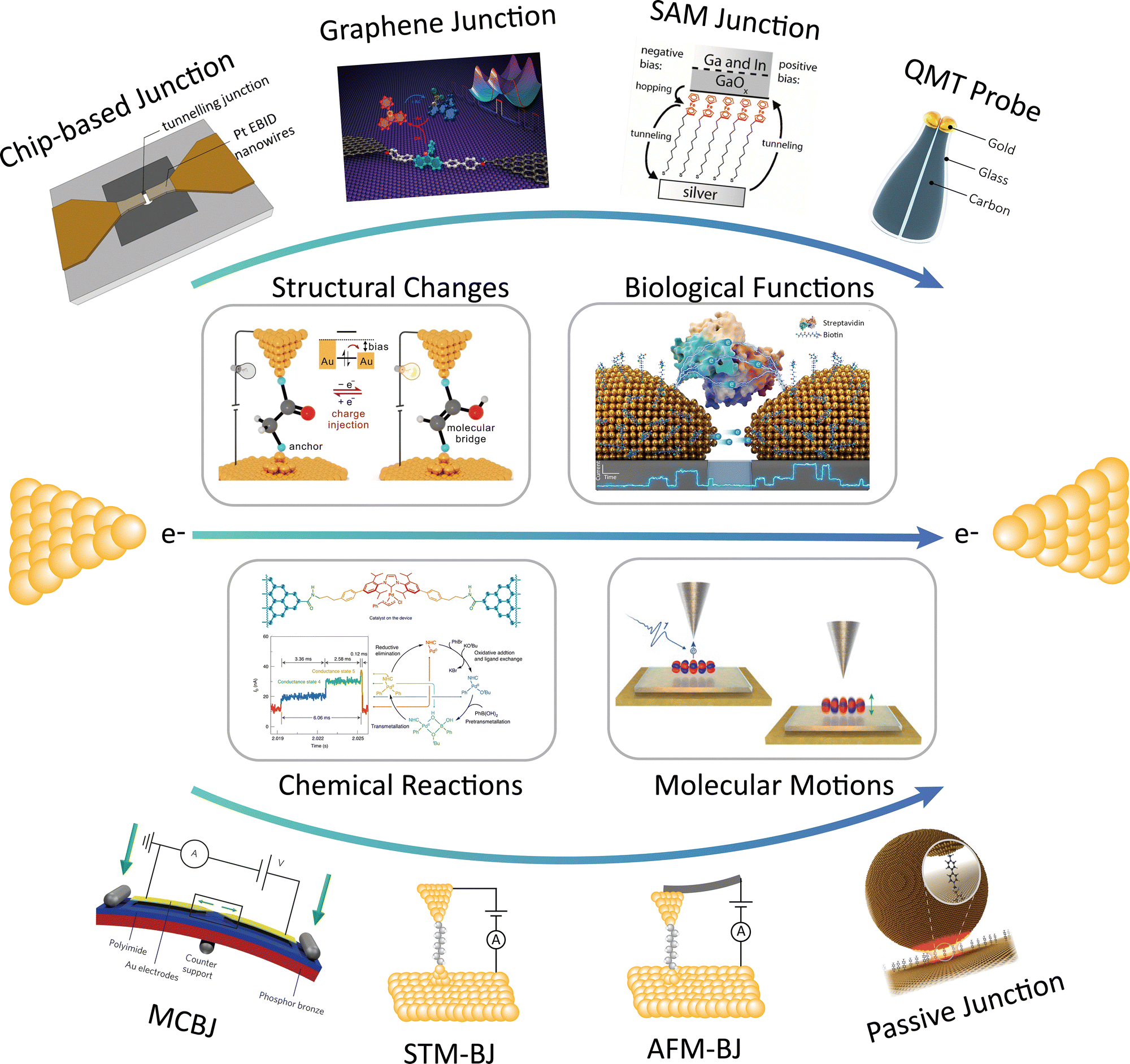 | Fig. 1 Schematic illustration of current quantum tunnelling platforms, along with applications. Panel (tunnelling junction with nanopore) is reprinted with the permission from ref. 277, Copyright (2014), American Chemical Society. Panel (graphene molecular junction) is reprinted with the permission from ref. 265, Copyright (2018), American Chemical Society. Panel (EGaIn junction) is reprinted with the permission from ref. 48, Copyright (2010), American Chemical Society. Panel (MCBJ) is reprinted with the permission from ref. 27, Copyright (2013), Springer Nature. Panel (Passive junction) is reprinted with the permission from ref. 130, Copyright (2017), Springer Nature. Panel (structural change) is reprinted with the permission from ref. 167, Copyright (2023), Springer Nature. Panel (biological functions) is reprinted with the permission from ref. 85, Copyright by Longhua Tang (2022), under CC BY 4.0 license. Panel (chemical reactions) is reprinted from ref. 266, Copyright (2021), Springer Nature. Panel (molecular motion) is reprinted with the permission from ref. 191, Copyright (2016), Springer Nature. | ||
